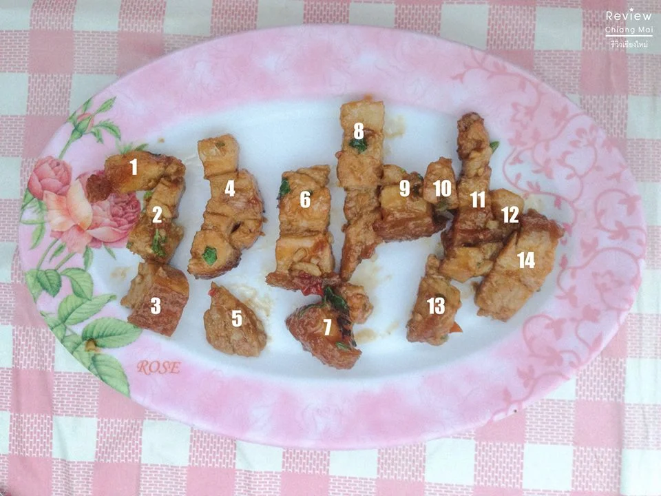 เริ่มจากเมนูแรก กะเพราหมูกรอบ ที่ให้หมูมาพอๆ กับข้าว หมูกรอบอยู่ที่ 14 ชิ้นถ้วน แต่ล่ะชิ้นให้มาแบบหนาๆ อิ่มๆ กันไปเลย ความสูงของข้าวจากระดับจาน 6 เซนติเมตร และข้าวที่ใส่มาในจานกว้าง 20 ซม. นับว่ากินแล้วอิ่มจนไม่อยากลุกไปไหนเลย