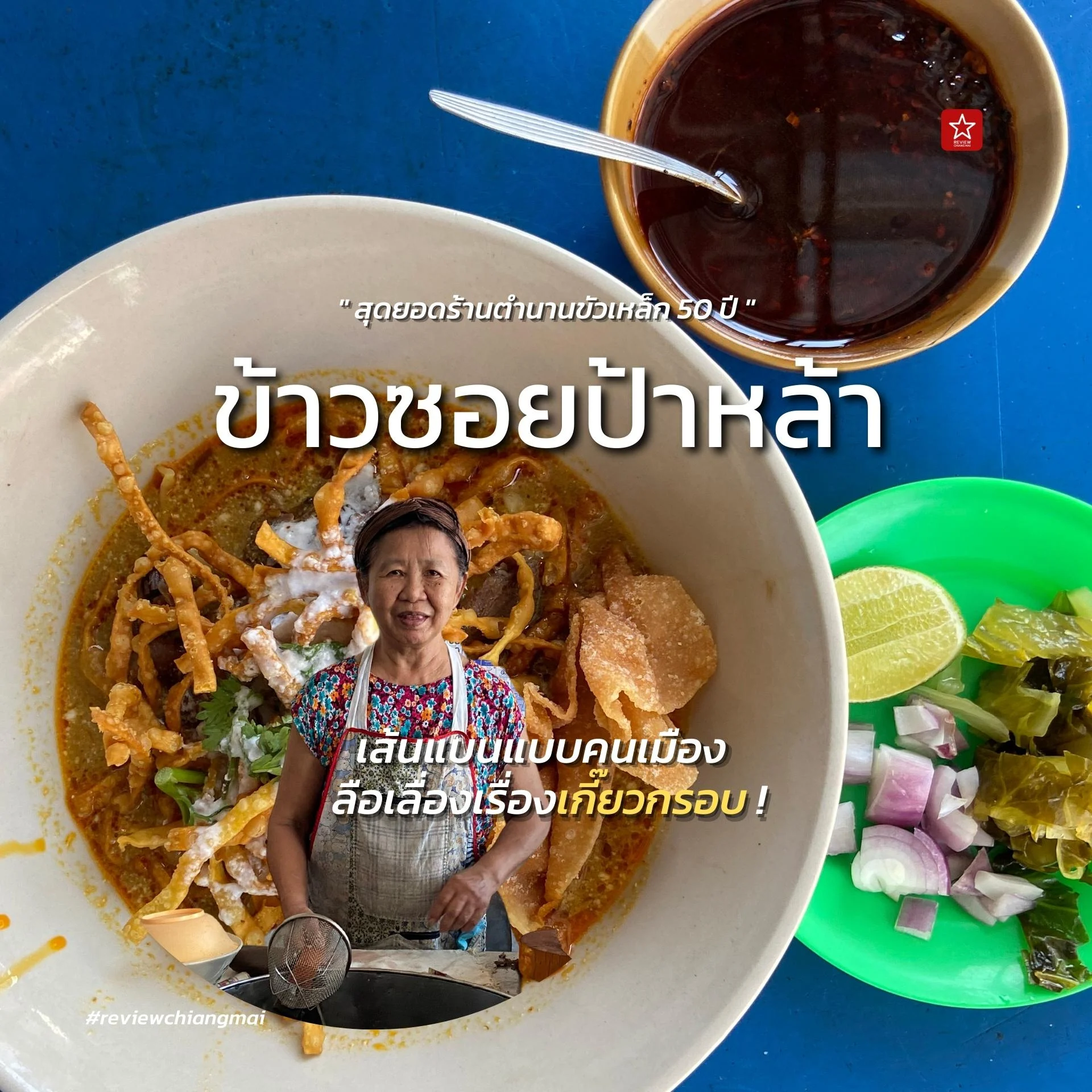 ร้านข้าวซอยป้าหล้า – ร้านข้าวซอยระดับตำนานที่เปิดมานานกว่า 50 ปี ในอดีตเป็นร้านข้าวซอยที่ขายอยู่ที่ขัวเหล็ก แต่ปัจจุบันทางร้าน ได้ย้ายร้านมามาขายกันที่ซอยกองทราย ย่านสันป่าข่อย ร้านข้าวซอยร้านนี้ ขอยกให้เป็นร้านข้าวซอยสุดแหวก เพราะเป็นร้านที่มีการนำ “เกี๊ยวกรอบ” ที่ใช้กับเย็นตาโฟมาใส่เป็นท็อปปิ้งในข้าวซอย คุณยายหล้าบอกว่าไอเดียการเพิ่มเกี๊ยวกรอบ มาจากการที่ลูกค้าอยากลองเอามาเกี๊ยวมารับประทานกับข้าวซอยดู ซึ่งแกก็จัดให้ จนสุดท้ายก็ได้ออกมาเป็นข้าวซอยเกี๊ยวกรอบอย่างในปัจุบัน นอกจากเกรี๊ยวจะกรอบอร่อย กินกับน้ำข้าวซอยแล้ว เส้นของที่นี่เองก็เรียกว่าคงสไตล์ดั้งเดิมไว้ โดยเส้นของทางร้านจะเป็น “ เส้นแบน” ให้สัมผัสที่นุ่มบาง กินง่าย สามารถกินต่อได้เรื่อยๆ น้ำข้าวซอยที่นี่ค่อนข้างจะออกรสหวาน แต่ผสมเข้ากับเกรี๊ยวกรอบ กินเข้าไปกับเส้นแบนๆ กำลังอร่อยพอดี ไม่หนัก เป็นข้าวซอยที่กินได้เรื่อยๆ ใครกินอะไรมา ก็มาแวะลองกินข้าวซอยที่นี่ต่อได้สบายๆ