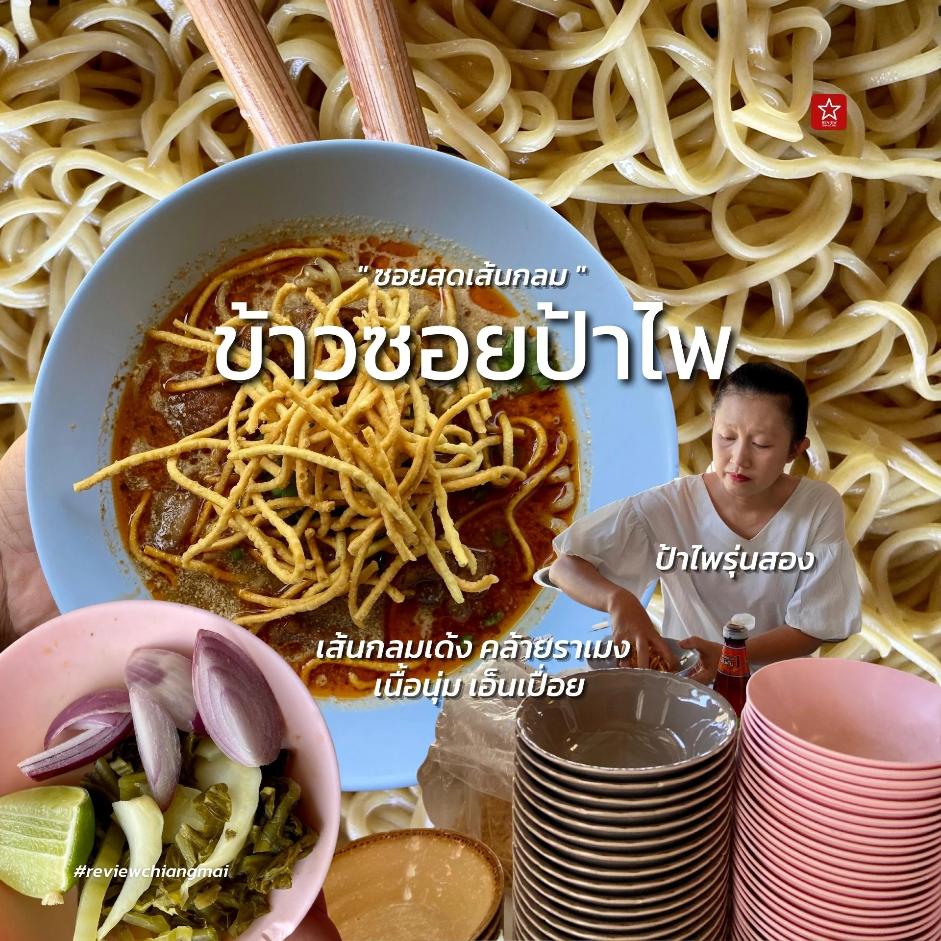 ร้านข้าวซอยป้าไพ – อยู่บริเวณย่านชุมชนมุสลิม โดยตอนนี้มีรุ่นสองอย่าง พี่หนึ่ง คอยดูแลแทนคุณป้าไพ แม้จะเป็นรุ่นสองแต่บอกเลยว่ารสมือความอร่อยไม่ได้เปลี่ยนไปแม้แต่น้อย เส้นข้าวซอยของที่นี่จะยังคงเป็นเส้นสด ที่นำมาลวกน้ำร้อนๆรอบต่อรอบ ใครมาได้แล้วทกินในรอบที่เขาเพิ่งลวกใหม่ๆ คือเดอร์เบส เส้นข้าวซอยของที่นี้เป็น “เส้นกลม” รับมาจากร้านที่รู้จักกันมานาน เวลากินให้ความรู้สึกเหมือนกินเส้นราเมงเด้งๆ ในน้ำข้าวซอยรสชาติกลมกล่อม ที่ราดด้วยหางกะทิ ตัวเนื้อเองถูกเคี้ยวรวมไปกับน้ำซุป ทำให้ทั้งเนื้อและเอ็น เปื่อยนุ่ม เคี้ยวหนุบหนับกำลังดี เครื่องเคียงที่นี่ก็ใช้ได้ ทั้งผักกาดดอง หอมแดงผ่าน พริกเผ็ดถึงใจ นอกจากข้าวซอย ทางหน้าร้าน มีร้านเกี๊ยวขายด้วยนะ มีทั้งเกี๊ยวซ่าไส้ไก่ ไส้แกงกะหรี่ไก่ ไส้กระเพราไก่ (สองรสหลังนี้ต้องโทรมาสั่งล่วงหน้ากับพี่นกก่อน) กินคู่กับข้าวซอยร้านป้าไพ คือเดินออกไปแบบสุขกาย สบายท้อง อยากบอกว่าทั้งเจ้าของร้านทั้งพี่หนึ่งและพี่นก ใจดี น่ารัก เป็นกันเองมาก