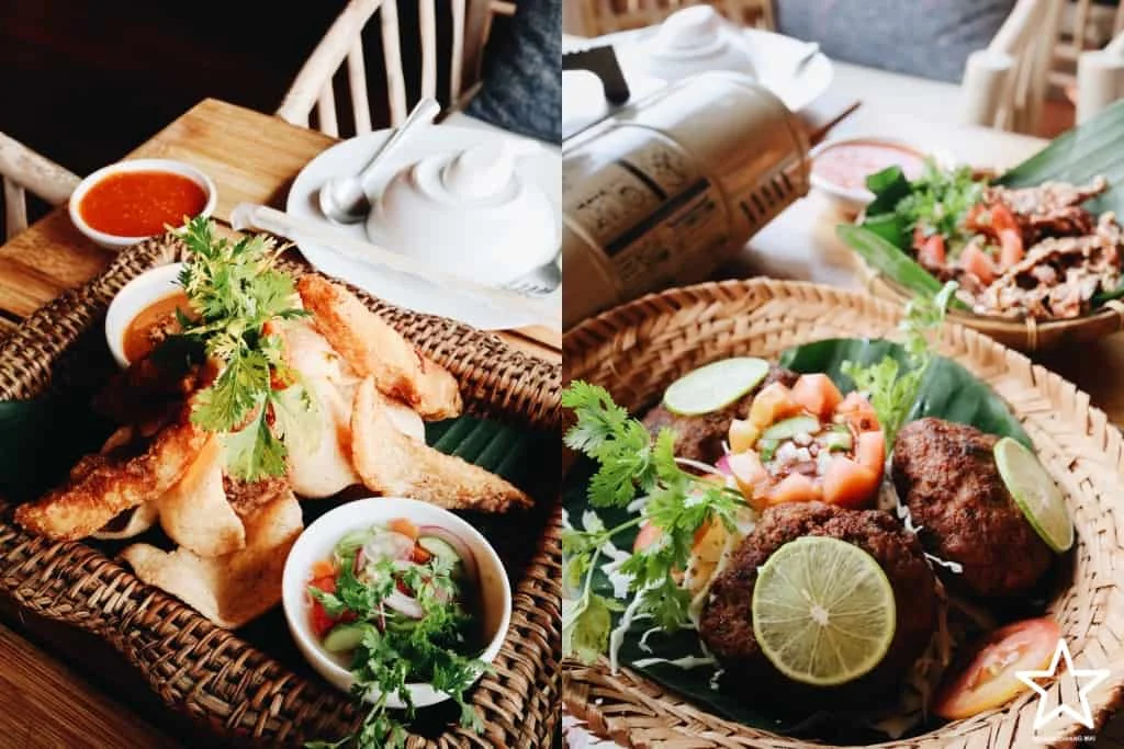 ด้านซ้ายคือปลาสะเต๊ะลานนาจิ้มกับน้ำจิ้มสูตรเด็ดรสชาติเข้ากัน ราคา 150 บาท ด้านขวาคือทอดมันไส้อั่ว เลิฟเมนูนี้มาก หอมกลิ่นไส้อั่วแบบเต็มๆ ราคา 125 บาท