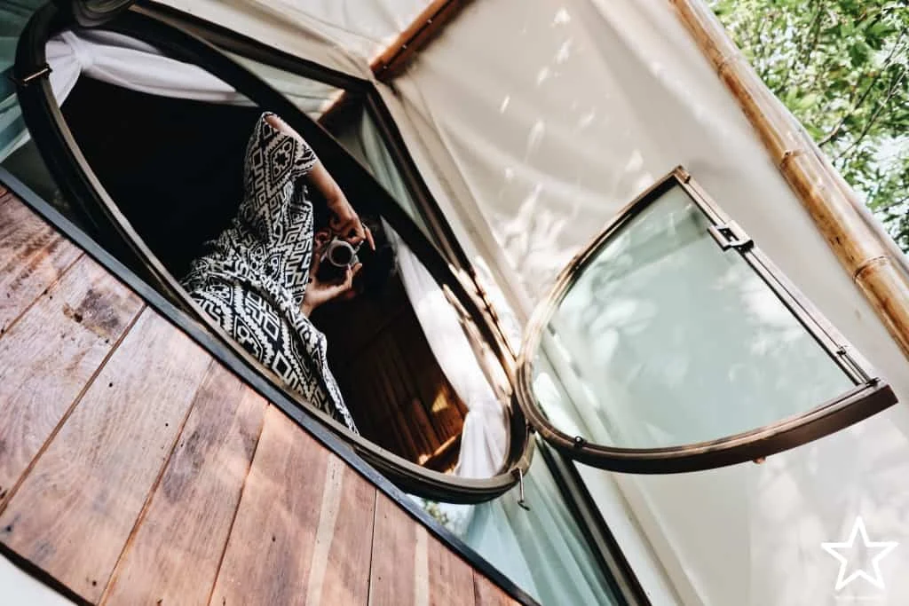 ใครอยากแต่งตัวแบบคุมธีมหรือแต่งตัวเป็นแก็งค์ เขาก็มีผ้าคลุมสวยๆ ให้สวมใส่ ด้านนอกเป็น Onsen ที่ชิวมาก จะแช่เวลาไหนก็ฟินไม่แพ้กัน ส่วนห้องน้ำนั้นหายห่วง ทุกอย่างพร้อมมาก เครื่องทำน้ำอุ่นก็มีเน้อ - Onsen tree tent ห้องพักสำหรับชาวแก็งค์ เต็นท์หลังใหญ่ พักได้สี่คน มี Onsen ด้วย หน้าตาเป็นไงดูได้จากรูปถัดๆ ไปเลยเน้อ