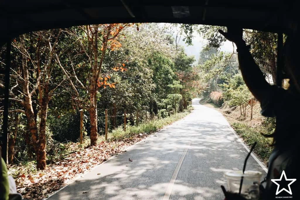 เราใช้เวลาเดินทางประมาณชั่วโมงกว่าๆ จากในตัวเมืองเชียงใหม่ไปที่พัก พอเลยโครงการหลวงตีนตกไปนิดหนึ่ง เราจอดรถไว้ที่บ้านของลุงสนั่น ชาวบ้านที่นั่นแล้วนั่งรถของลุงไปที่ Lan Na Wild เพราะทางไปค่อนข้างคดเคี้ยวและชันมาก ที่พักอยู่ใกล้ร้านกาแฟไจแอนท์ ร้านกาแฟบนต้นไม้ที่หลายคนรู้จักนั่นเอง ใครไม่ชำนาญทางแนะนำให้นั่งรถชาวบ้านขึ้นไปเน้อ เที่ยวละ 50 บาท เบอร์ลุงสนั่น >> 089-951-3163