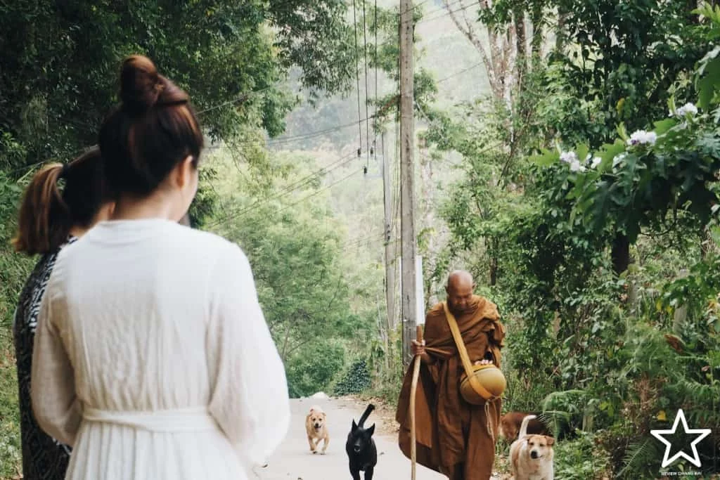 ทาง Lan Na Wild มีกิจกรรมตักบาตรยามเช้าด้วยนะ พระเดินมาจากวัดในหมู่บ้านนี่เอง เพราะที่พักตั้งอยู่ในหมู่บ้านป็อก หมู่บ้านเล็กๆ กลางป่าใหญ่