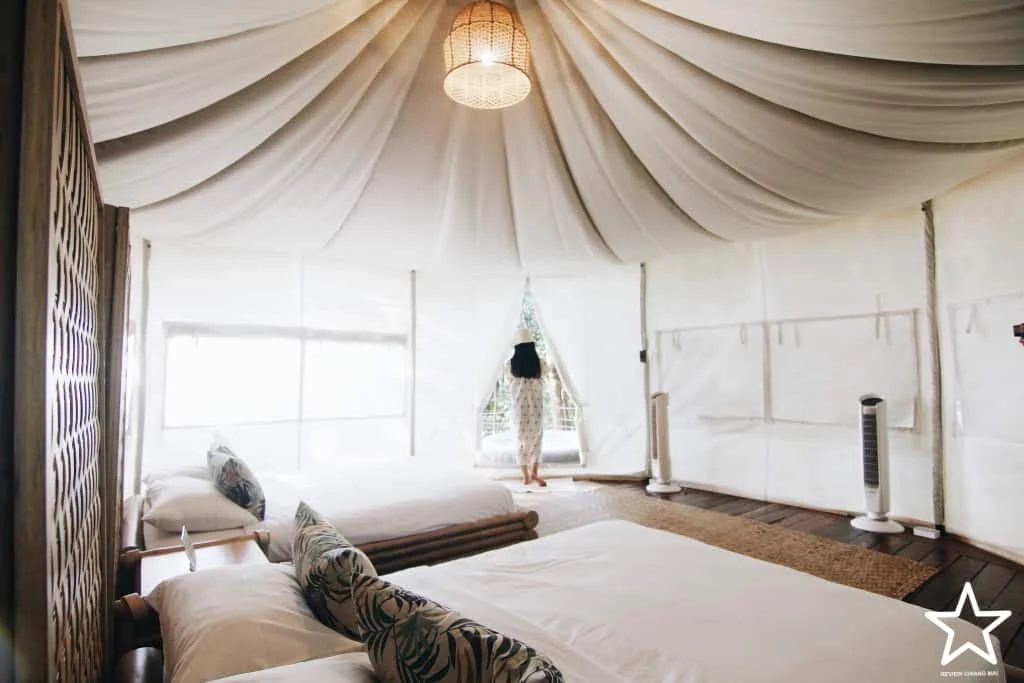 เต็นท์หลังใหญ่มีสองเตียง นอนได้ 4 คน สิ่งอำนวยความสะดวกครบมาก เหมาะสำหรับการพักผ่อนกับแก็งค์เพื่อน