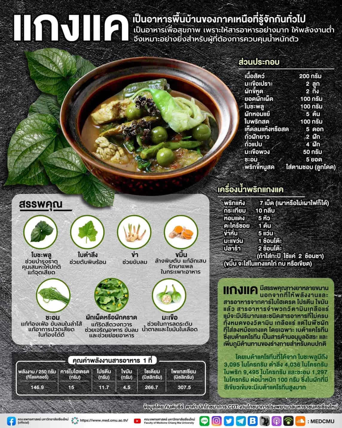 แกงแค เป็นอาหารพื้นบ้านของภาคเหนือที่รู้จักกันทั่วไป แกงแคเป็นอาหารเพื่อสุขภาพ เพราะให้สารอาหารอย่างมาก ให้พลังงานต่ำ จึงเหมาะอย่างยิ่ง สำหรับผู้ที่ต้องการควบคุมน้ำหนักตัว มีสรรพคุณทางยาหลายขนาน