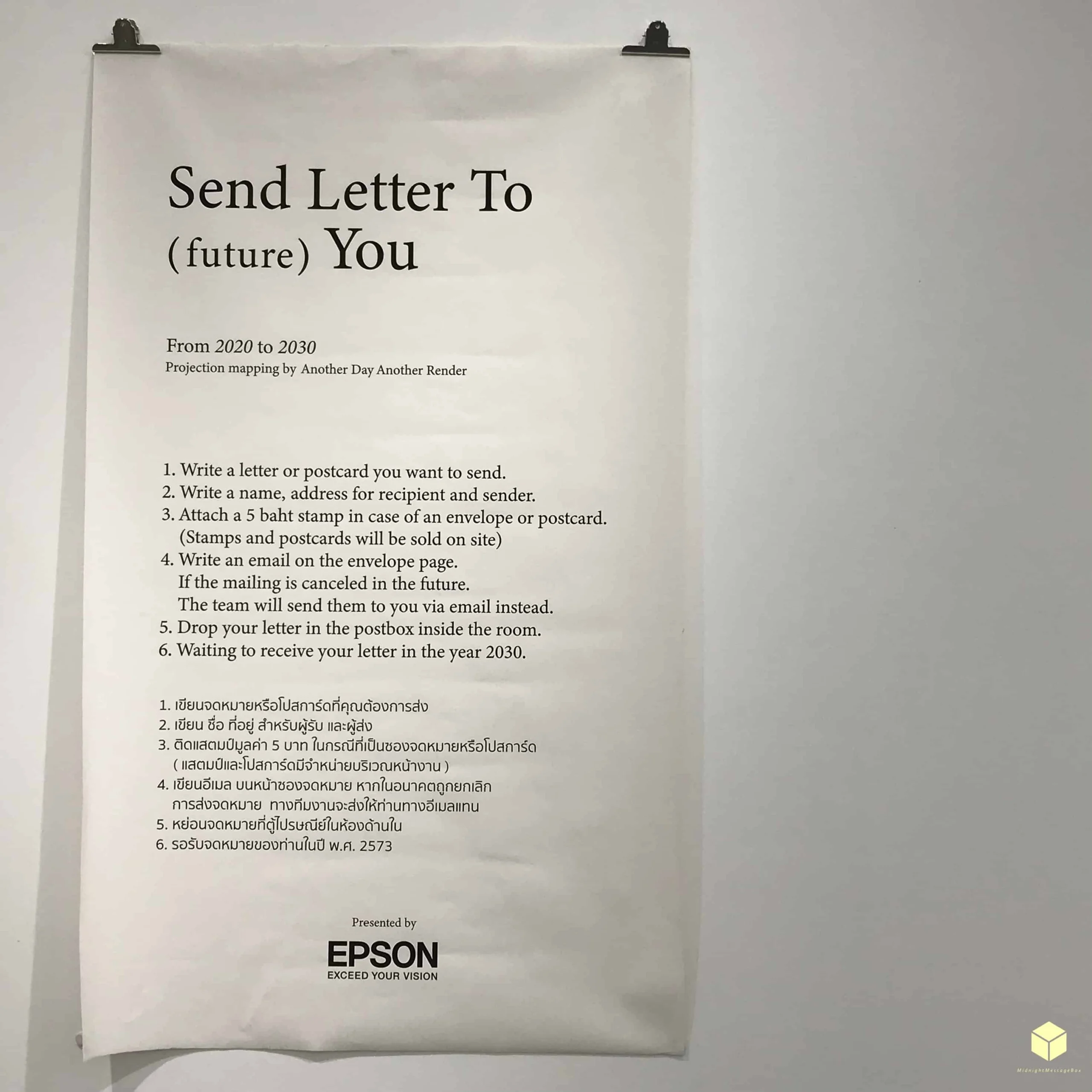 โดยในท้ายที่สุดนั้น ก็พบว่า มันยังมีอีกหนึ่งสิ่งที่ผู้เข้าชม สามรถเข้าร่วมเป็นส่วนหนึ่งกับงานนี้ แถมมันก็คือกิจกรรมหลักสุดพิเศษ ที่เราสามารถเขียน “จดหมาย” ถึงตัวเอง “ในอีก10ปีข้างหน้า”