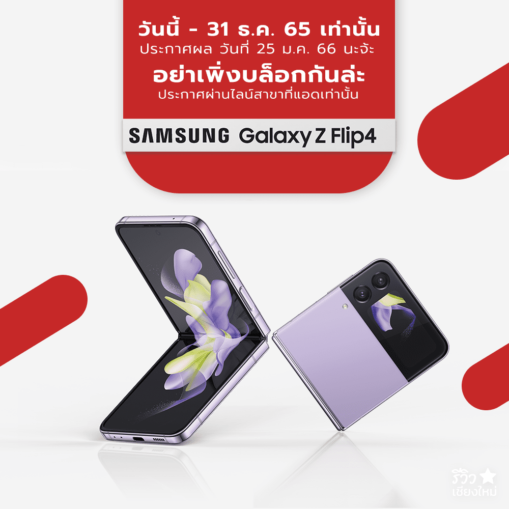 แอดไลน์พร้อมลงทะเบียนปั๊บ ลุ้นรับ Samsung Galaxy Z Flip4 ถึง 25 เครื่อง วันนี้ – 31 ธ.ค. 65 เท่านั้น ประกาศผล วันที่ 25 ม.ค. 66 จ้าววว อย่าเพิ่งบล็อกกันเน้อ ประกาศผ่านไลน์สาขาที่แอดเท่านั้น!