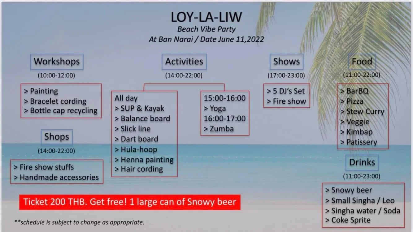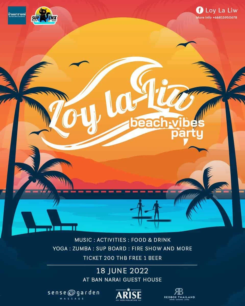 ครั้งแรกกับงานสไตล์ Beach event ณ บ้านนารายณ์เกสเฮ้าส์ งานเดียวที่รวบรวมกิจกรรรมของชาวบีชมาไว้ในงาน ไม่ว่าจะเป็น yoga, zumba, hulahoop, fire show, SUP, balance board, slick line, henna paint และอีกมากมาย พร้อมโยกไปกับเพลงหลากหลายแนว จาก DJ’s สายอินดี้ของเชียงใหม่ถึง 7 ชีวิต