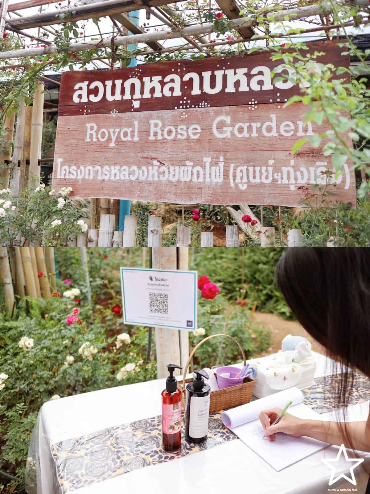 ถึงแล้ว สวนกุหลาบหลวง ศูนย์พัฒนาโครงการหลวงทุ่งเริง ก่อนอื่นต้องลงทะเบียนเช็คอินและล้างมือด้วยเจลล้างมือกันก่อน
