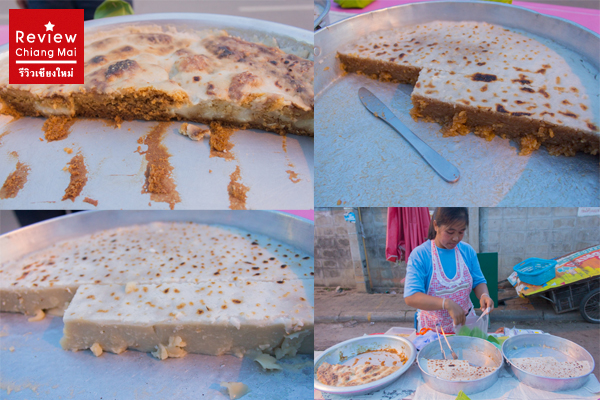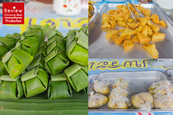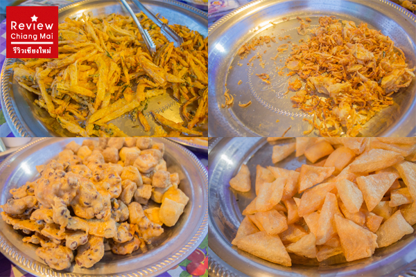 ร้านค้ามีหลากหลาย แต่เมนูที่ไม่ควรพลาด คือ ขั่งปอง (ซ้าย – ขวาบน) คล้ายกระบองทอดแต่ใช้มะละกอ หอมแดง (ต้องหอมไทยเท่านั้นถึงจะอร่อย) ฟักทอง หัวปลีขึ้นอยู่กับว่าจะใช้วัตถุดิบชนิดใดนำมาทอดกับแป้งและเครื่องปรุงรส ผสมใบเล็บครุฑเพื่อให้หอมน่าทาน รสชาติเผ็ดๆมันๆนิยมทานคู่กับขนมจีนน้ำเงี้ยว หรือน้ำจิ้มอาจาดก็เข้ากันไม่น้อย ราคาเริ่มต้น 10-20 บาท นอกจากนี้ยังมีขนมถั่ว เป็นของหวาน โถ่พูซิ่ง (ซ้ายล่าง) คือเต้าหู้ทอด นิยมขายคู่กับตือคาโคในบ้านเรา โถ่พูเหลือง (ขวาล่าง) ทำมาจากถั่วชนิดหนึ่ง รสชาติมันๆเค็มๆ นิยมทานกับน้ำจิ้มคล้ายกับน้ำจิ้มตือคาโค แต่รสชาติเปรี้ยวกว่า