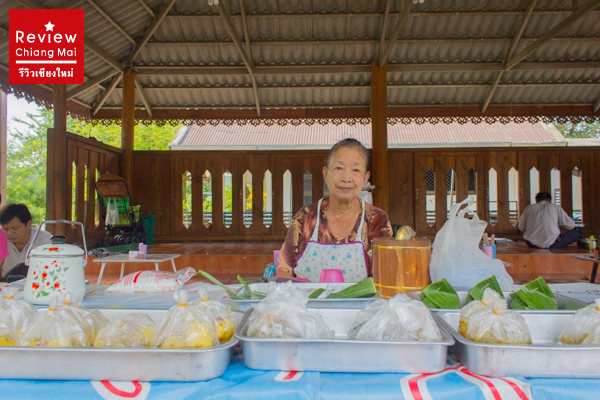 “เมี่ยงหวาน” (ซ้าย) ถูกห่อด้วยใบตองอย่างดี  “โถ่พูเหลือง” (ขวาบน) ทำมาจากถั่วชนิดหนึ่ง รสชาติมันๆเค็มๆ และ “ข้าวเหลืองเนื้อลุง” (ขวาล่าง) หอมกลิ่นพริกแกงอร่อยเข้ากัน