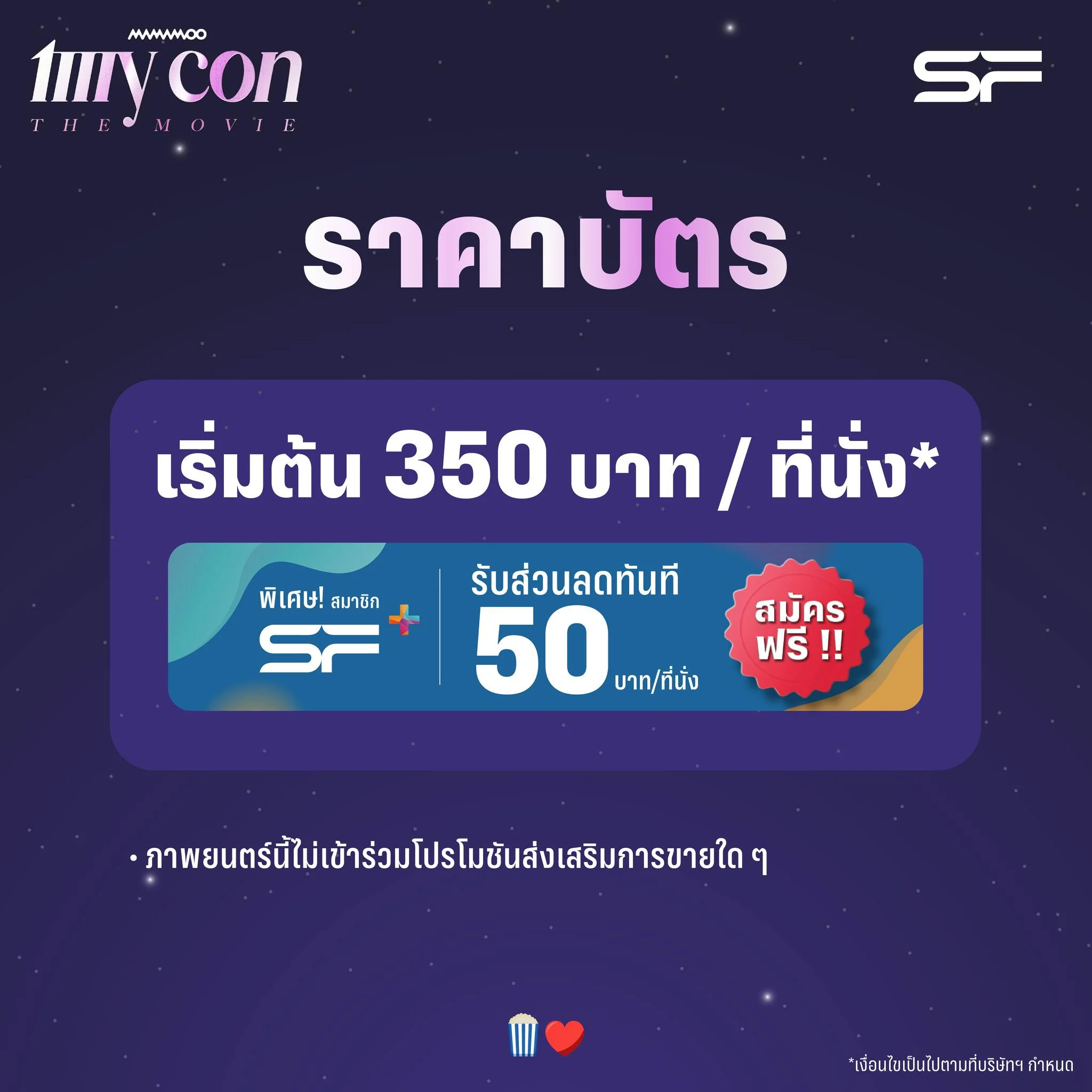 บัตรราคาเริ่มต้น 350 บาท / ที่นั่ง สาขากรุงเทพฯ เริ่มต้น 400 บาท / ที่นั่งสมาชิก SF+ รับส่วนลดทันที 50 บาท / ที่นั่ง