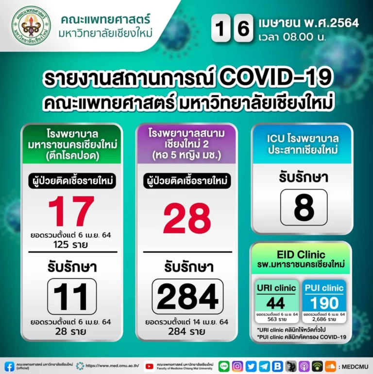มีผู้ป่วยที่เข้ารับการรักษาตัวในรพ. มหาราชนครเชียงใหม่ รวมทั้งหมดจำนวน 11 ราย ในจำนวนนี้เป็นผู้ป่วยที่ได้รับการยืนยันว่าติดเชื้อโควิด-19 จำนวน 10 ราย และผู้ป่วยที่กำลังรอผลยืนยันการตรวจเชื้อโควิด19 จำนวน 1 ราย นอกจากนี้มีผู้ป่วยอีก 8 รายที่ได้รับการดูแลโดยทีมแพทย์และพยาบาลของคณะแพทยศาสตร์ มหาวิทยาลัยเชียงใหม่ อีก 8 ราย ณ โรงพยาบาลประสาทเชียงใหม่