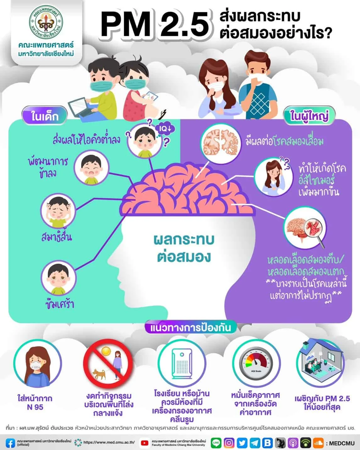 ฝุ่น PM 2.5 เวลาเราเห็นไกลๆ ก็เป็นเหมือนหมอกควันธรรมดา แต่โดยแท้ที่จริงแล้วมีขนาดเล็กมาก จนเรียกได้ว่าเป็นเพชฌฆาตเงียบ เพราะ PM 2.5 มีผลกระทบต่อสมองโดยตรง สามารถผ่านเข้าสมองได้โดยตรง ทำให้สมองเสียหายได้ มีผลทั้งระยะสั้น มึนงง เวียนศีรษะ ปวดหัวมากขึ้น และมีผลในระยะยาวซึ่งทำให้สมองเสื่อมมากขึ้น เกิดอัมพฤกษ์อัมพาตมากขึ้น ฝากให้ทุกคนดูแลตัวเอง ดูแลคนที่เรารัก และเตือนคนที่กำลังเผาอยู่ก่อให้เกิด PM 2.5 อยากให้มีส่วนรับผิดชอบต่อสังคมร่วมกัน