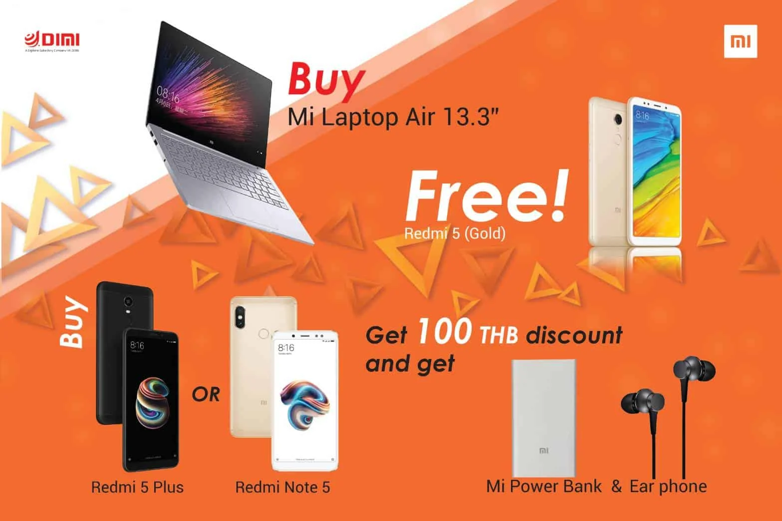 เมื่อซื้อ Mi Laptop Air 13.3 FREE มือถือ Redmi 5 (Gold) หรือซื้อมือถือ Redmi 5 Plus หรือ Redmi Note 5 แลกรับส่วนลด 100 บาทในการซื้อ Mi Power Bank + Earphone นอกจากนั้นเพียงซื้อ Ecosystem ภายในร้าน ชิ้นที่ 2 ลด 10%, ชิ้นที่ 3 ลด 20% ยังไม่หมดเพียงเท่านี้ทุกยอดการซื้อสินค้าครบ 5,000 บาท รับส่วนลด 100 บาท 8,000 บาท รับส่วนลด 200 บาท 12,000 บาท รับส่วนลด 300 บาท
