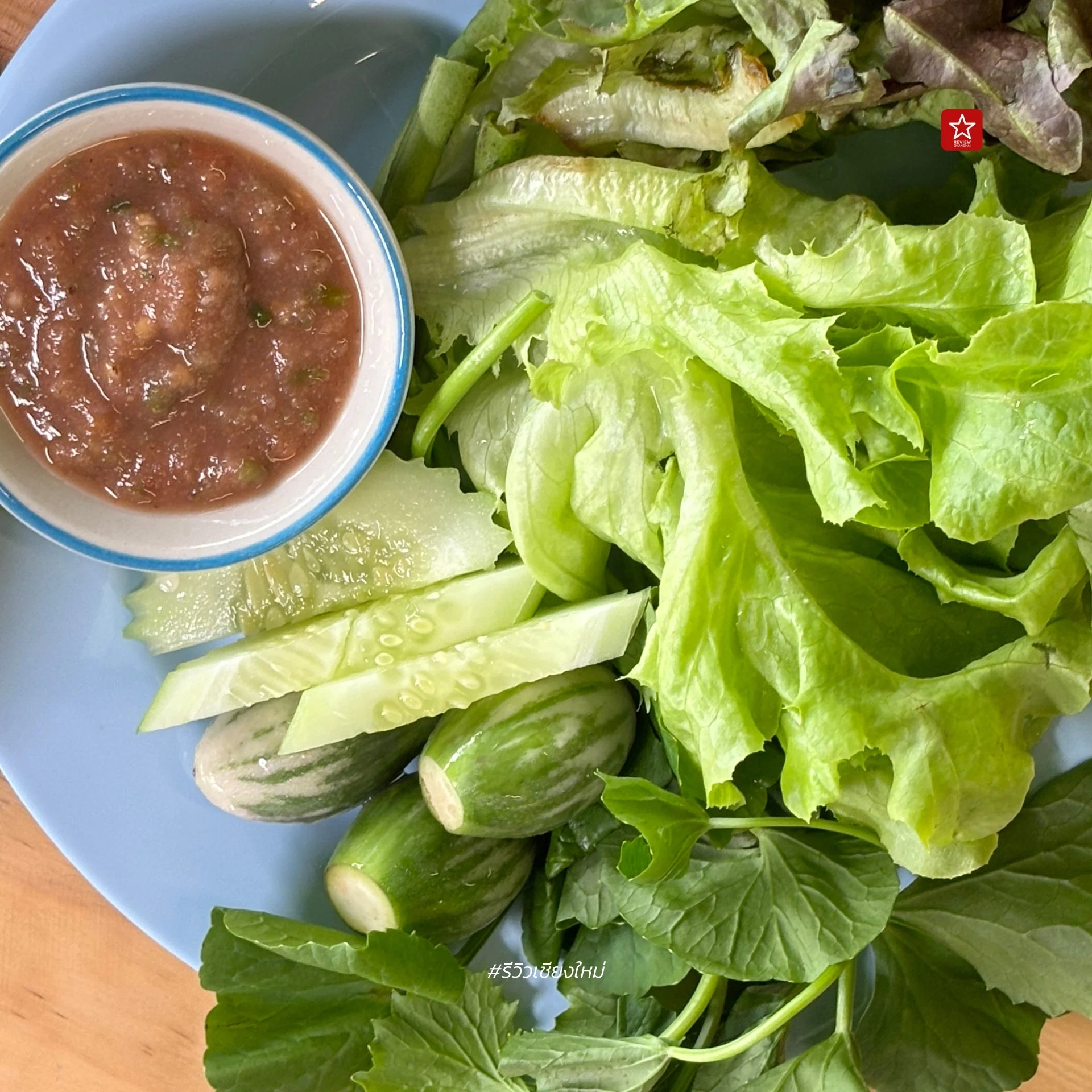 “น้ำพริก ผักสดเนี่ยครับตักฟรีได้เลยตักฟรีได้เลยตักกินได้เลยเต็มที่”