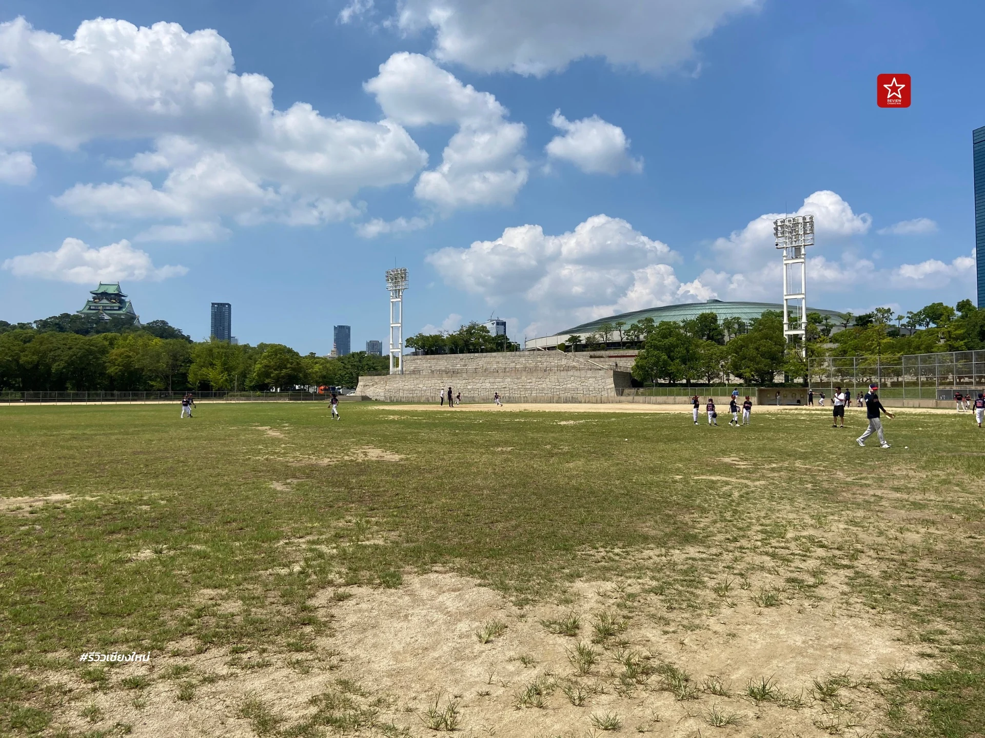 เดินออกมาจาก ปราสาทโอซาก้า เจอ Osaka Castle Baseball Field สนามเบสบอลที่อยู่ข้างปราสาทโอซาก้า เป็นสิ่งแปลกตาสำหรับคนไทยที่ไม่เคยเห็นคนเล่นกีฬาเบสบอลมาก่อน
