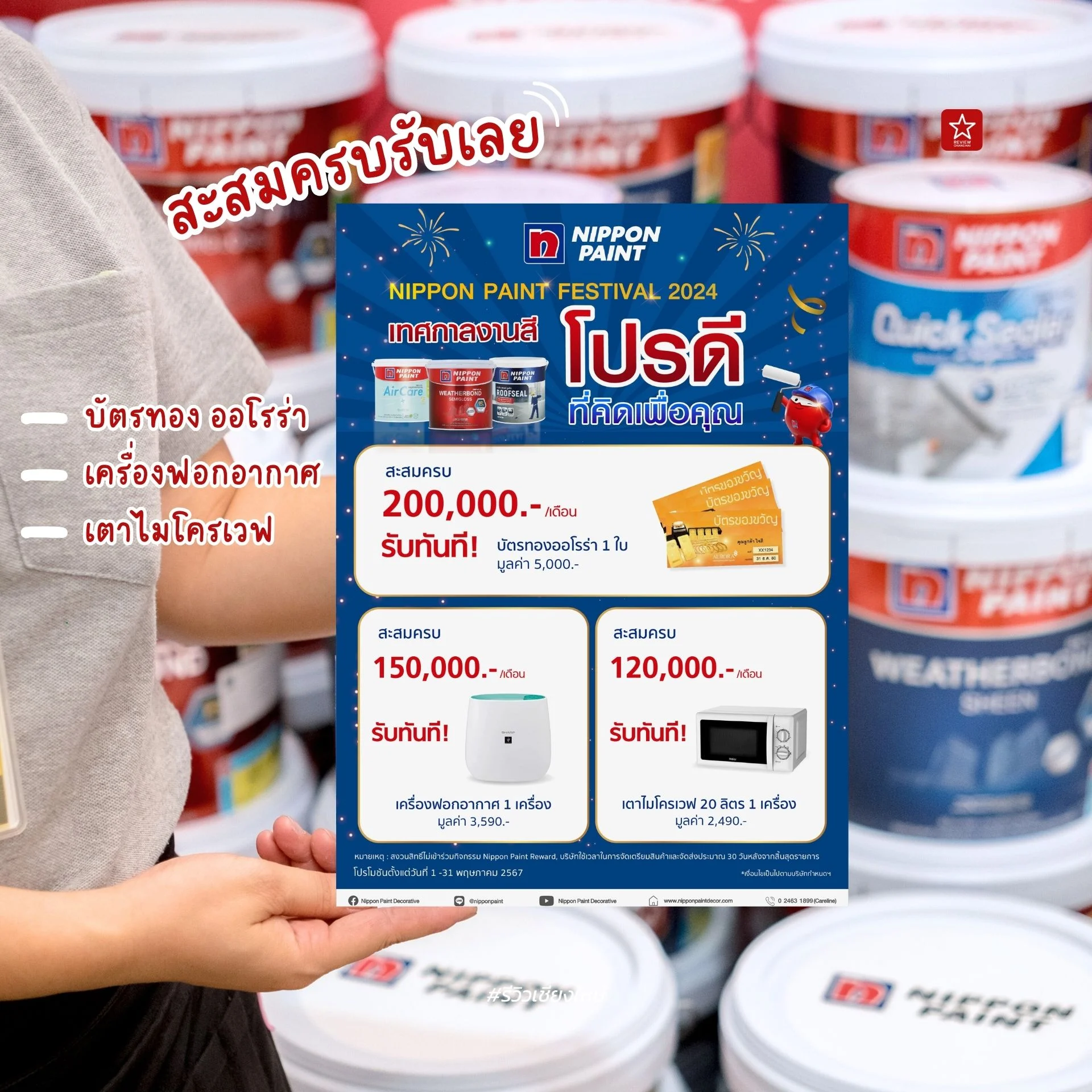 *เงื่อนไขการร่วมกิจกรรมเสริมการขาย Nippon Paint Festival เป็นไปตามที่ บริษัท นิปปอนเพนต์ เดคโคเรทีฟ โคทติ้ง (ประเทศไทย) จำกัด กำหนด