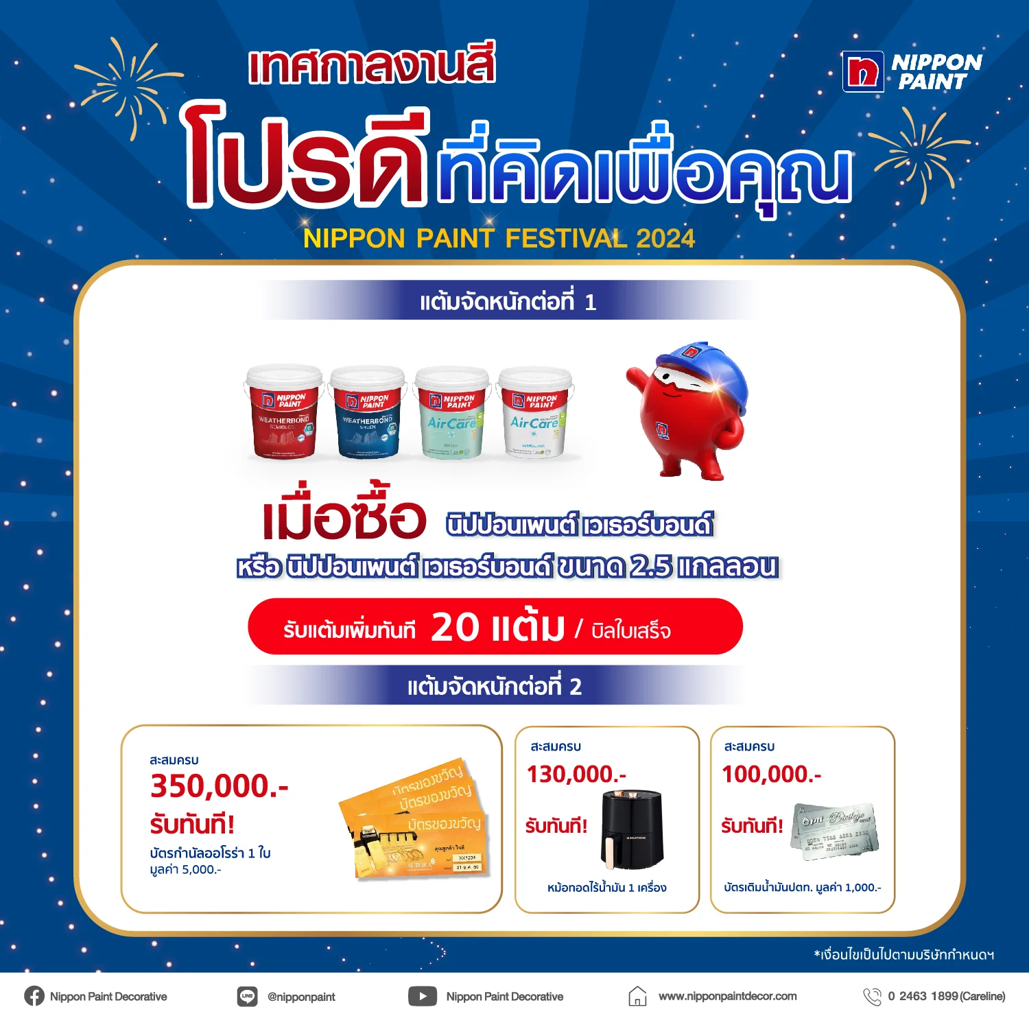 - เมื่อซื้อนิปปอนเพนต์ เวเธอร์บอนด์ หรือ นิปปอนเพนต์ แอร์แคร์ ขนาด 2.5 แกลลอน รับแต้มเพิ่มทันที 20 แต้ม/บิลใบเสร็จ
