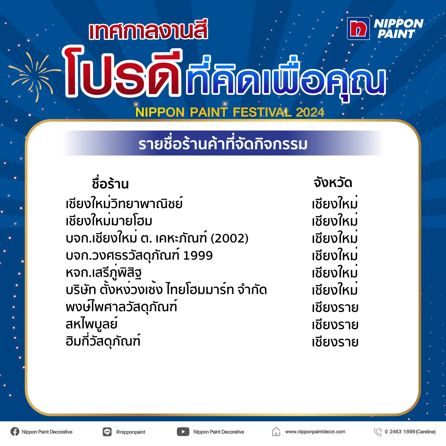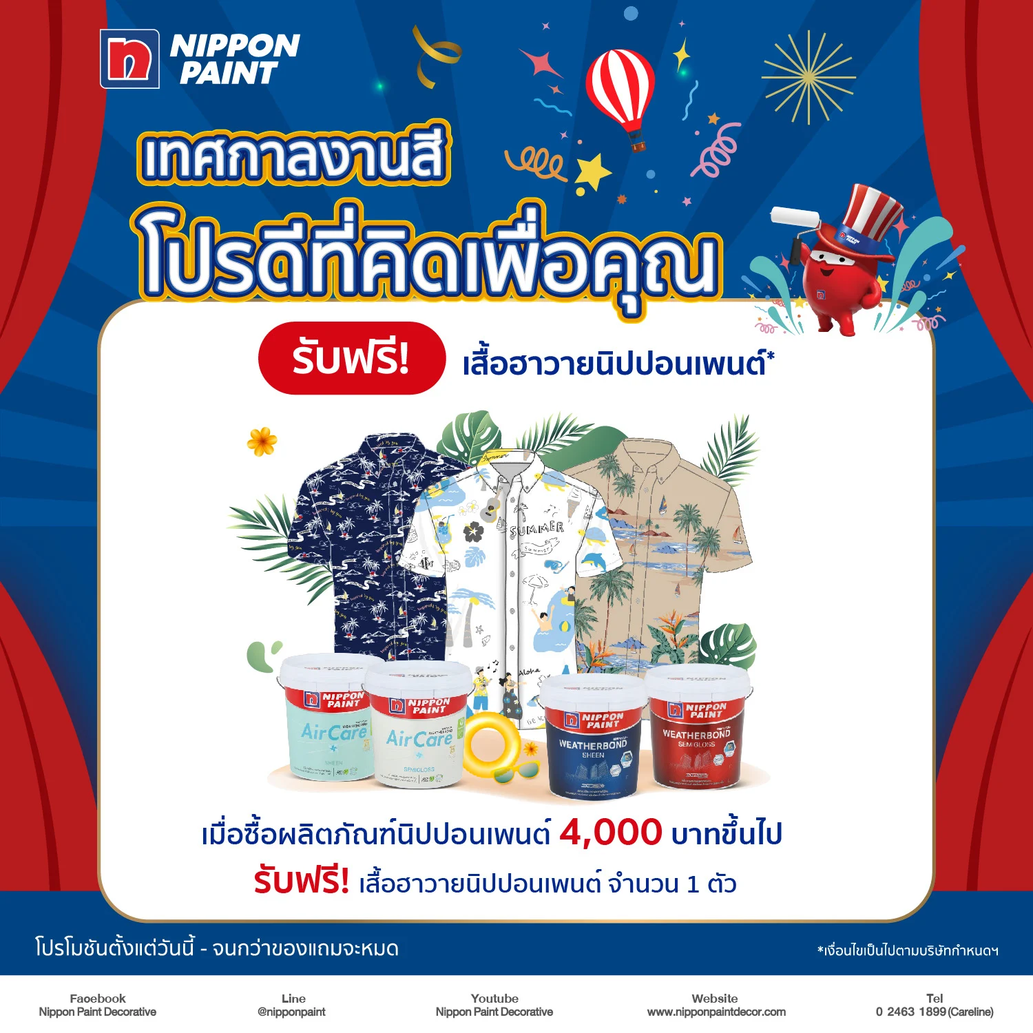 - เมื่อซื้อผลิตภัณฑ์นิปปอนเพนต์ 4,000 บาทขึ้นไป รับเสื้อฮาวายนิปปอนเพนต์ จำนวน 1 ตัว ฟรี!