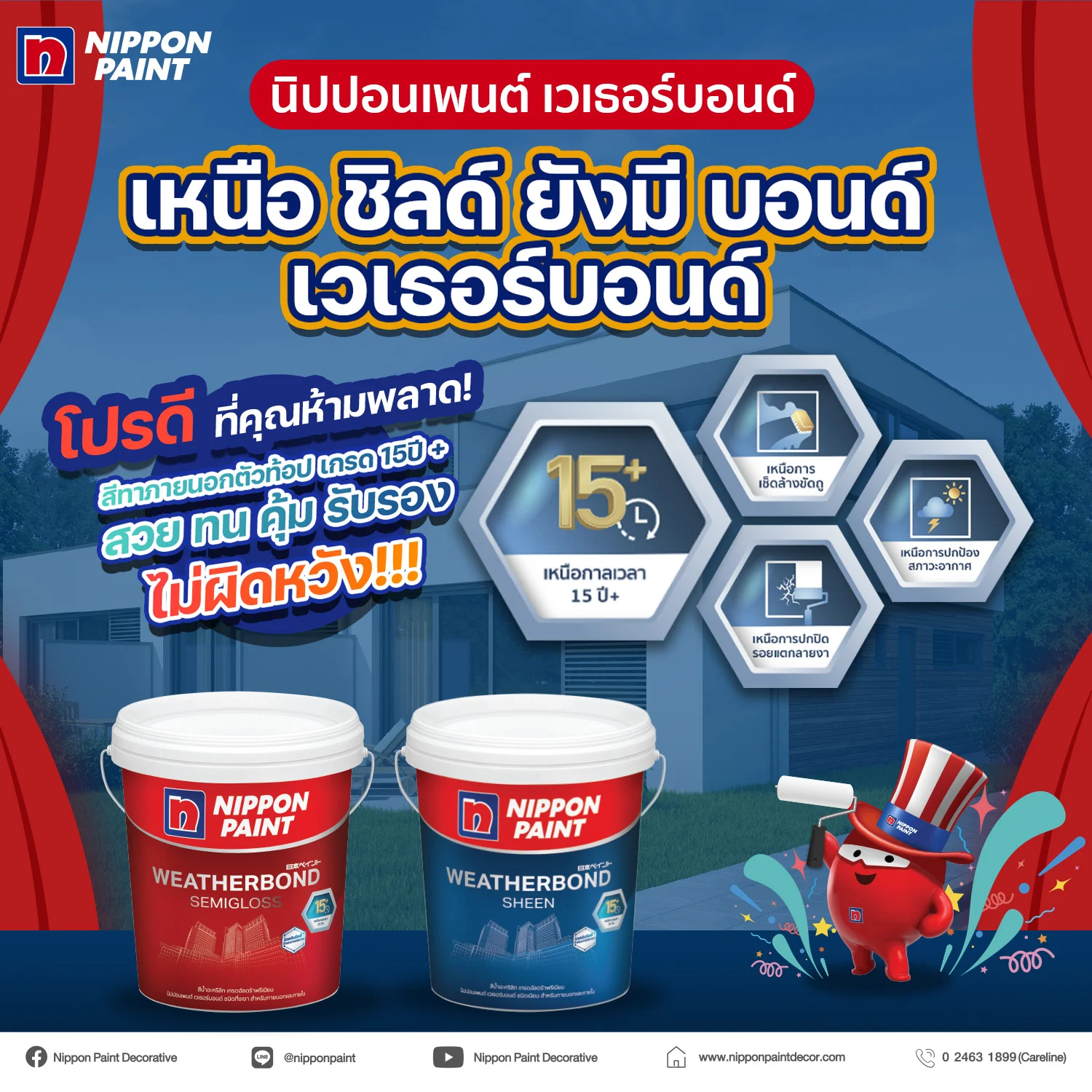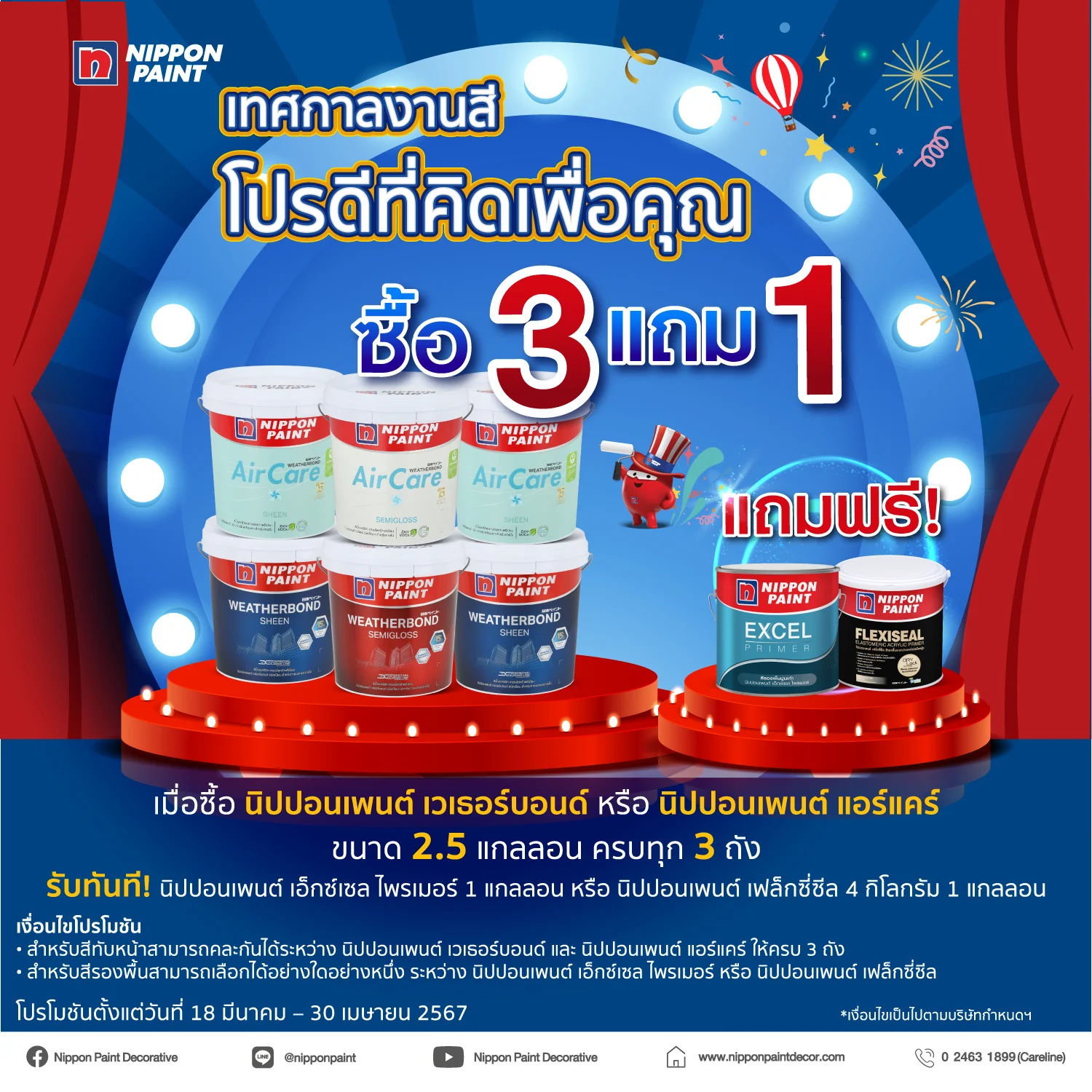 - เมื่อซื้อนิปปอนเพนต์ เวเธอร์บอนด์หรือนิปปอนเพนต์ แอร์แคร์ ขนาด 2.5 แกลลอน ครบทุก 3 ถัง รับทันที! นิปปอนเพนต์ เอ็กซ์เซล ไพรเมอร์ 1 แกลลอน หรือ นิปปอนเพนต์ เฟล็กซี่ชีล 4 กิโลกรัม 1 แกลลอน