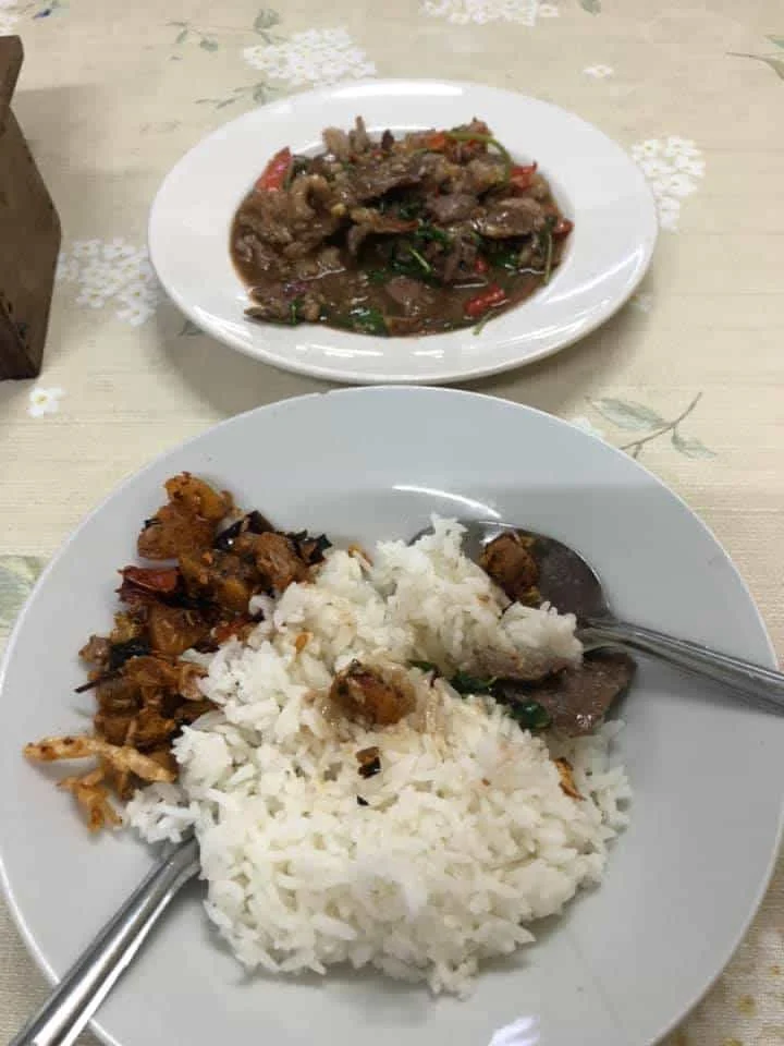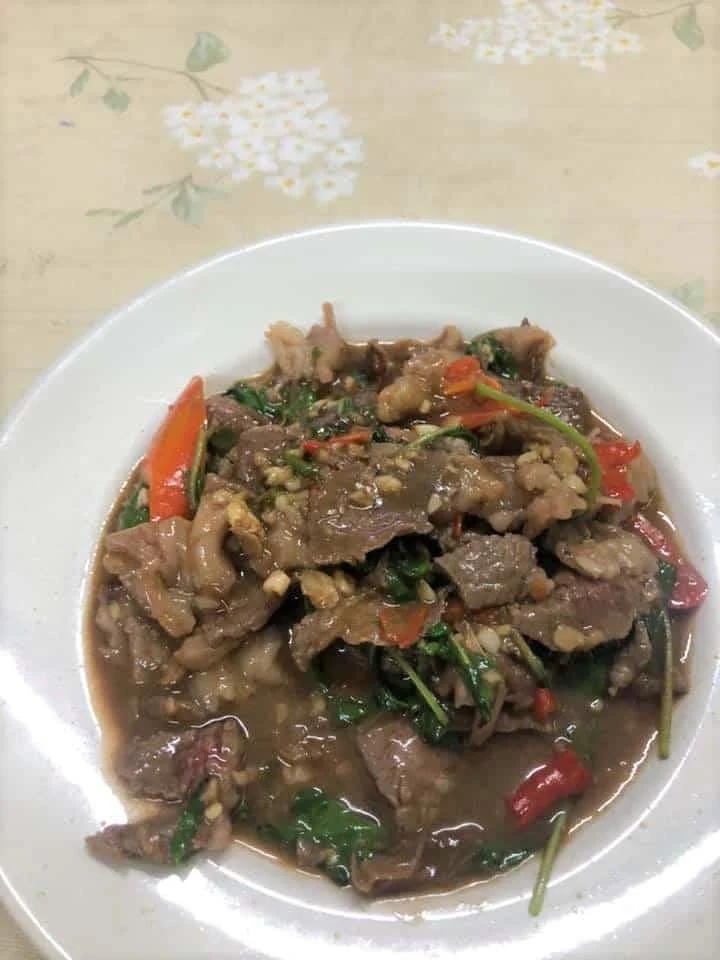 อาหารเค้าว่าอร่อยประเภทปูผัดผงกระหรี่ ไข่ระเบิด อะไรทำนองนี้แต่ผม แฮ้งค์เหล้าอยากลองอะไรเผ็ดๆ นี่เลย กระเพราเนื้อวากิว 199 บาท คนชอบเนื้อนี่คุ้มค่าครับ นุ่ม หอม เผ็ด ละลายในปาก ข้าว1 จานเค้าแถมกากหมูคั่วพริกมาให้ เข้ากันขั้นสุด ไม่มีเวลาหาเบอร์โทรให้ เอาเป็นว่าไปลองดูเถอะ ป้ายเขียนบอกสรรพคุณเต็มข้างฝา น่าจะการันตีได้