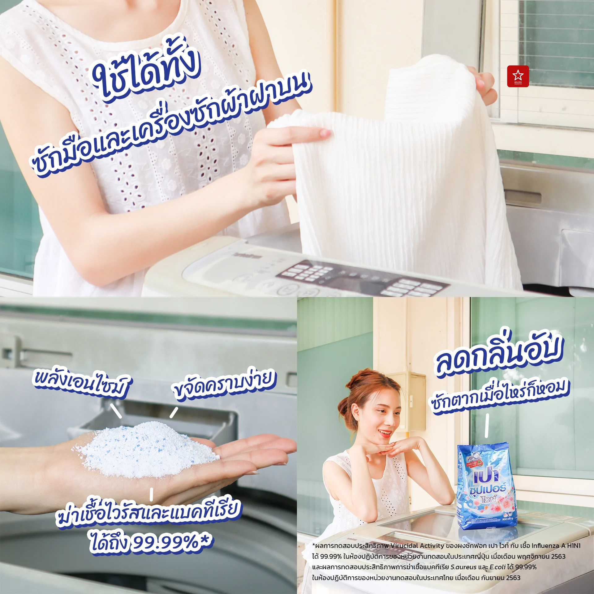 - ฆ่าเชื้อไวรัสและแบคทีเรียได้ถึง 99.99%* ผ้าสะอาดมั่นใจได้มากยิ่งขึ้น