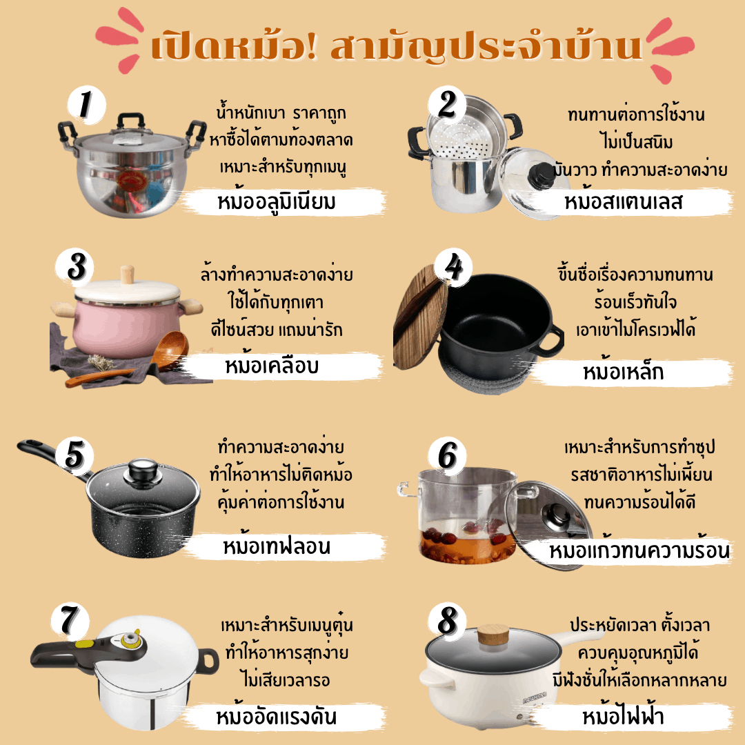 หม้อ ชื่อนี้ทุกคนต้องมีติดบ้าน ติดครัวกันอยู่แล้ว ถ้าเปรียบเป็นยาก็คงเป็นยาสามัญประจำบ้าน ขาดไม่ได้เลย เพราะเป็นสิ่งที่สร้างสารพัดประโยชน์ ให้กับการทำอาหาร ทั้ง แกง ซุป ต้ม ก็ทำได้หมด แต่หม้อไม่ได้มีแบบเดียวนะ มีหลายแบบเลย คนที่ทำอาหารบ่อยๆ หรือ คนที่เรียนเกี่ยวกับการทำอาหารมา ก็อาจจะพอรู้มาบ้าง แต่แม่บ้านมือใหม่หลาย ๆ คน ก็อาจจะยังไม่รู้ ว่าแต่ละแบบใช้ต่างกันยังไง เหมาะกับการทำอาหารแบบไหน เมนูไหน อย่าเสียเวลารีรอกันเลย วันนี้เราเลยจะมารีวิวหม้อให้ฟังกัน!