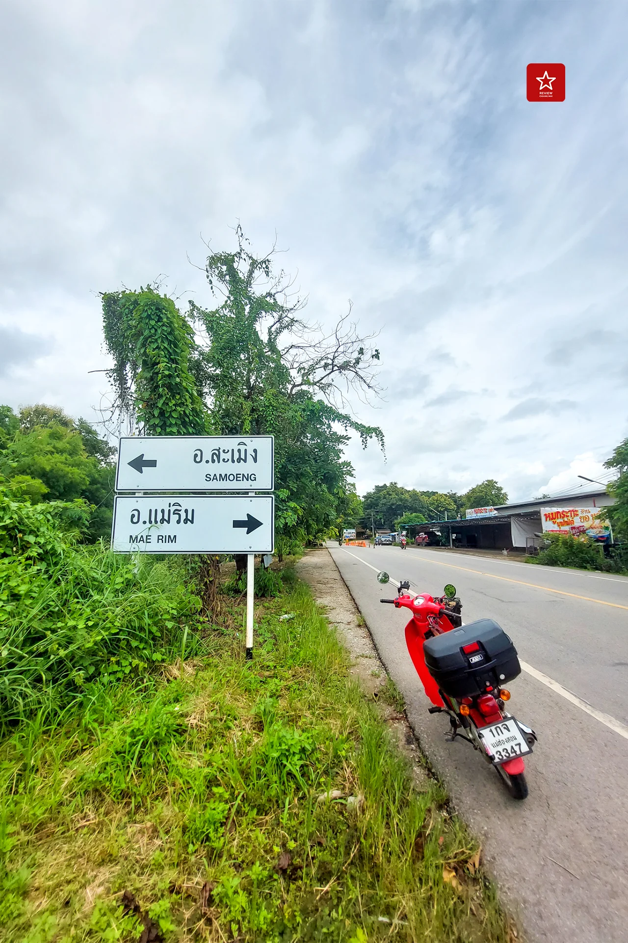 ออกจากวัดเราก็ตัดเข้าถนนสาย 1096 แม่ริม – สะเมิง บริเวณนี้มีสถานที่แหล่งท่องเที่ยวมากมายเป็นระยะ จะมีรถทัวร์นักท่องเที่ยว และรถชาวบ้านสัญจรวิ่งสวนไปมา