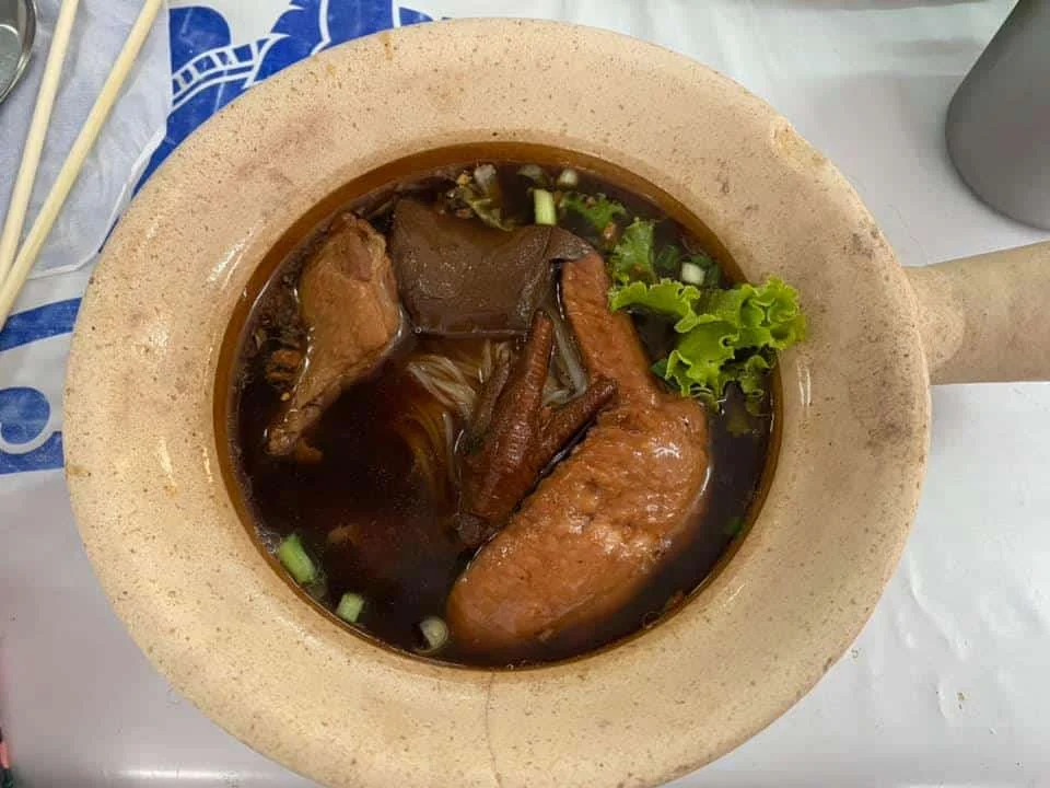 สำหรับผมเมนูที่สั่งมาคงเป็นอะไรไม่ได้นอกจากก๋วยเตี๋ยวไก่ตุ๋นยาจีน ผมสั่งเส้นเล็กมาแบบธรรมดา พอทางร้านทำเสร็จก็ยกกันมาแบบหนักๆ ที่หนักก็เพราะเป็นถ้วยกระเบื้องที่ดูใหญ่ มีด้ามจับโผล่ออกมา จนผมอดสงสัยไม่ได้ว่า ตกลงเป็นถ้วยหรือหม้อกระเบื้องกันแน่ก่อนจะปรุงก็ต้องชิมกันซะก่อนเพื่อเช็ครสชาติน้ำซุป พอมั่นใจในรสชาติแล้ว ก็เดินหน้าปรุงรสให้มันเข้าเครื่องกันทันที และพอได้สัมผัสหลายๆคำ ก็พอจะเจาะถึงรสชาติไปเป็นฉากๆดังนี้