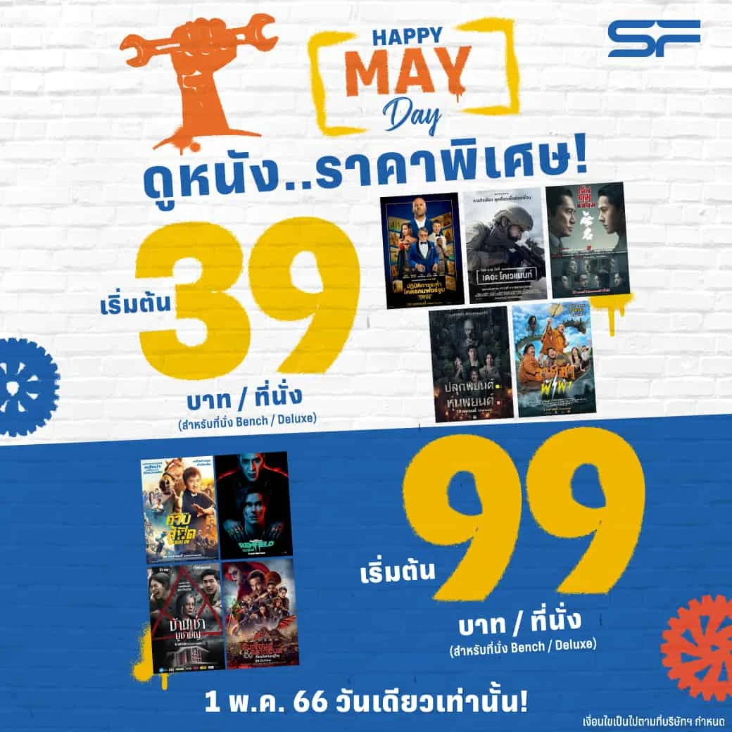 ราคาพิเศษเริ่มต้น 39 บาท และราคาพิเศษเริ่มต้น 99 บาท (สำหรับที่นั่ง Deluxe) ทุกรอบ ทุกสาขา (ยกเว้น โรงภาพยนตร์พิเศษ, โรงภาพยนตร์และที่นั่ง First Class และ VIP) 1 พ.ค. 66 วันเดียวเท่านั้น