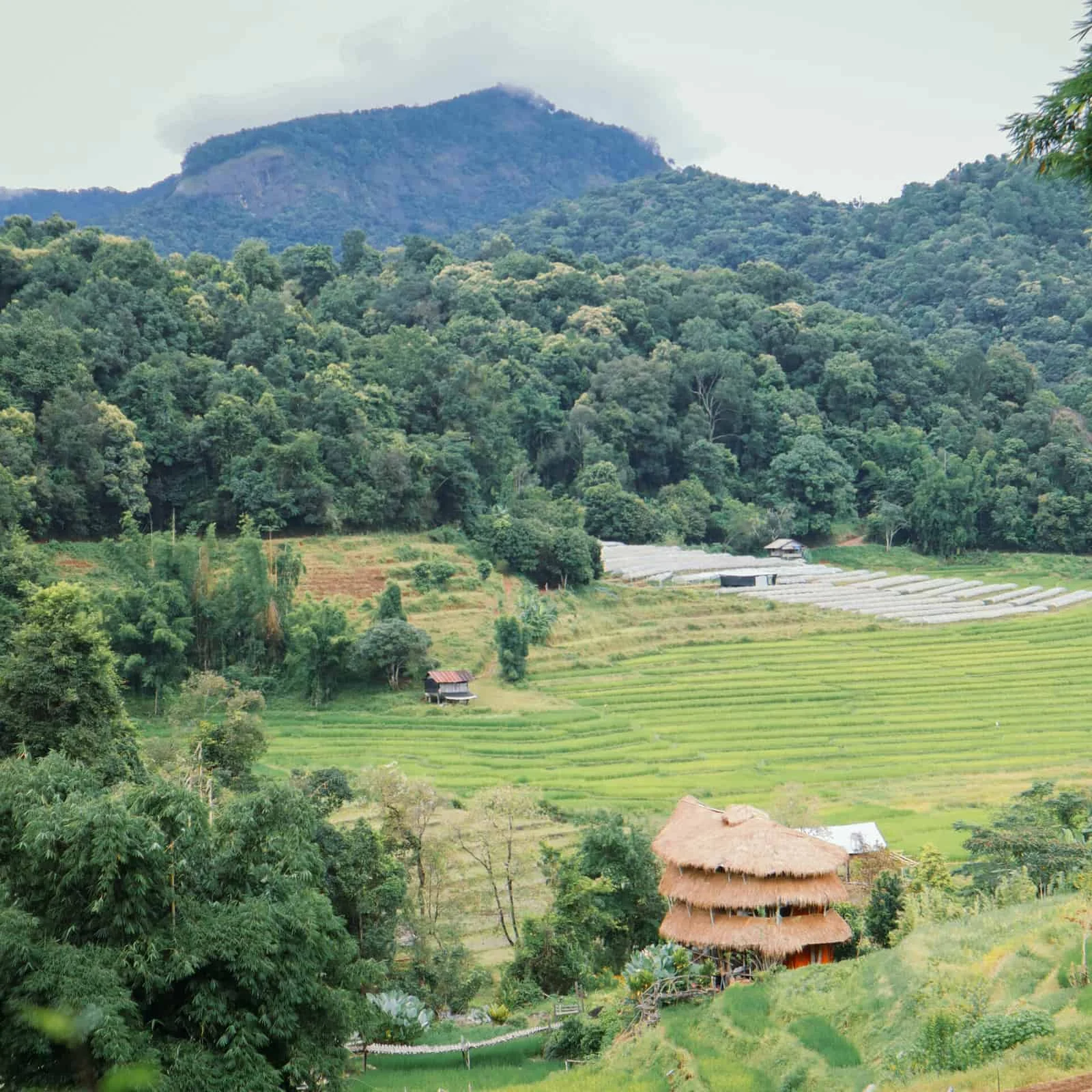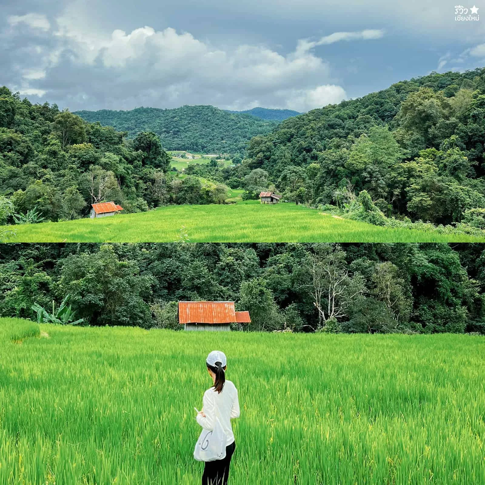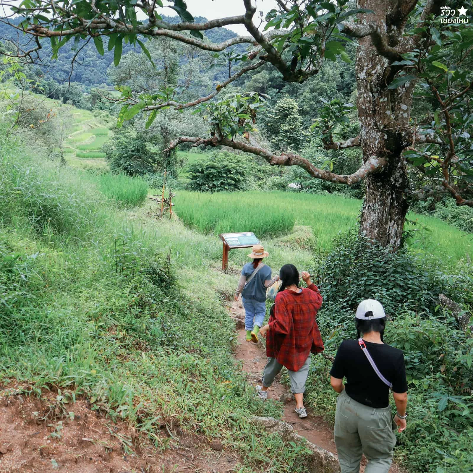 ขากลับเราเลือกที่จะไม่กลับทางเดิมที่เดินมา เลือกเดินไปข้างหน้าเพื่อเรียนรู้สิ่งดีๆ ที่กำลังรออยู่ หลังออกจากป่าก็จะเจอทุ่งนากว้าง ที่เรียงเป็นนาขั้นบันได เรียงกันไปสุดลูกหูลูกตา ทุ่งข้าวสีเขียวเพิ่มความสดชื่นให้มีกำลังใจในการเดินต่อ มาที่นี่ครั้งเดียวก็เหมือนได้เที่ยวสองที่
