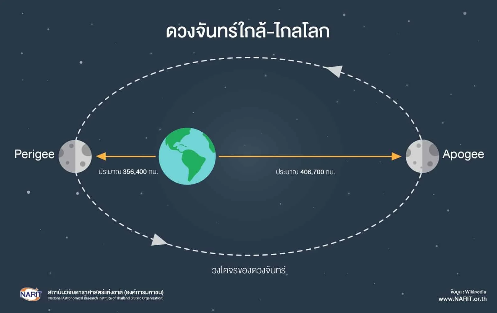 ดวงจันทร์โคจรรอบโลกเป็นรูปวงรี 1 รอบใช้ระยะเวลาประมาณ1เดือน ดังนั้นในแต่ละเดือนจะมีตำแหน่งที่ดวงจันทร์ใกล้โลกที่สุดเรียกว่า เปริจี (Perigee) มีระยะทางเฉลี่ย 356,400 กิโลเมตรและตำแหน่งที่ไกลโลกที่สุดเรียกว่า อะโปจี (Apogee) มีระยะทางเฉลี่ยประมาณ 406,700 กิโลเมตร การที่ผู้คนบนโลกเห็นดวงจันทร์ใหญ่กว่าปกติในคืนที่ดวงจันทร์เต็มดวง ไกลโลก นับเป็นเหตุการณ์ปกติที่สามารถอธิบายได้ตามหลักการทางวิทยาศาสตร์