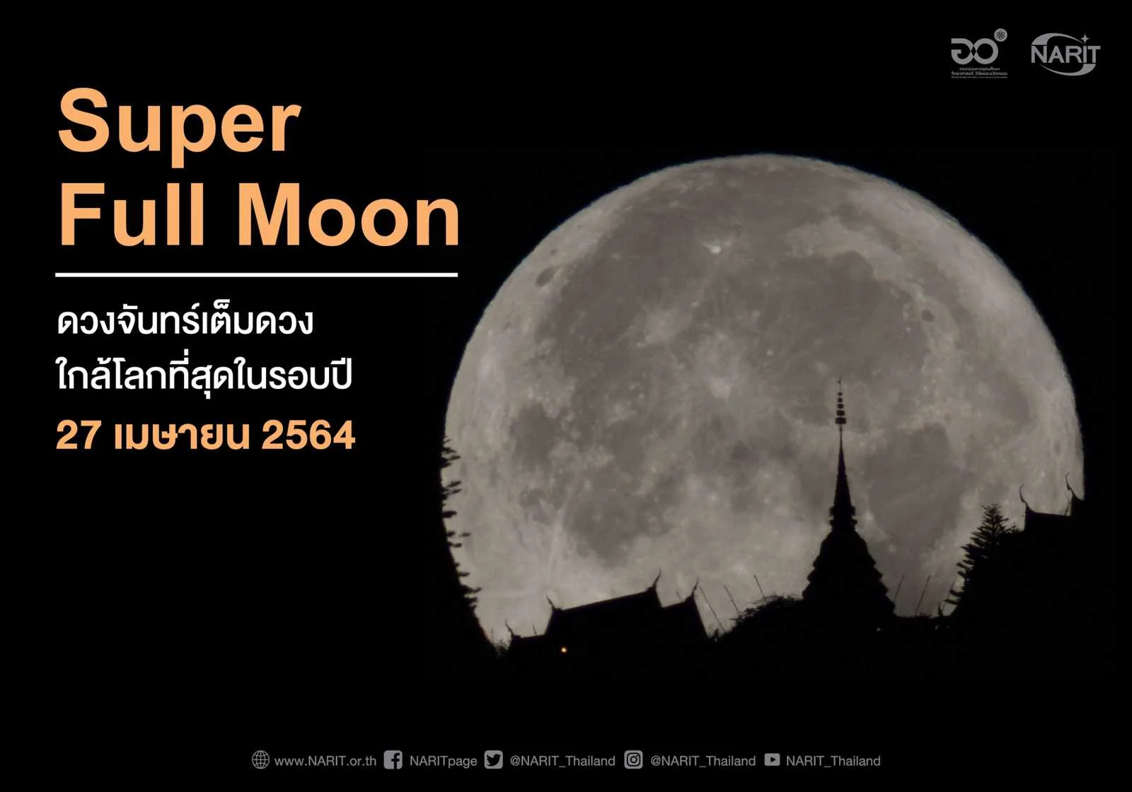 นายศุภฤกษ์ กล่าวเพิ่มเติมว่า อีกหนึ่งปรากฏการณ์ชวนติดตามอย่างยิ่ง คือ “ดวงจันทร์เต็มดวงใกล้โลกที่สุดในรอบปี” หรือ ซูเปอร์ฟูลมูน (Super Full Moon) คืนวันอังคารที่ 27 เมษายน 2564 เวลา 22:25 น. ดวงจันทร์จะโคจรมาอยู่ตำแหน่งใกล้โลกที่สุดในรอบปี ที่ระยะทาง 357,370 กิโลเมตร คืนดังกล่าวดวงจันทร์เต็มดวงจะมีขนาดปรากฏใหญ่กว่าปกติเล็กน้อย