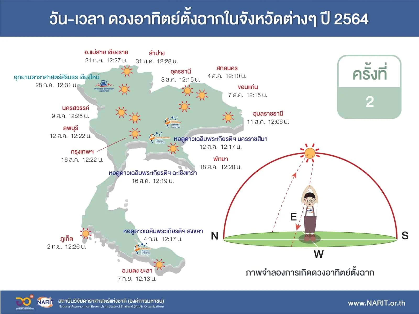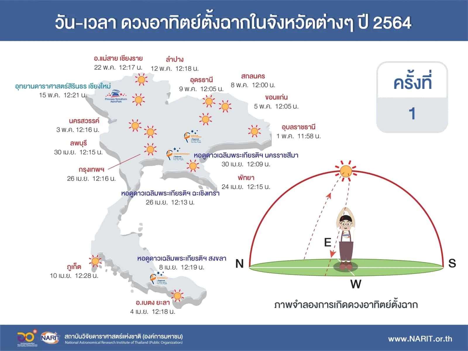 “ดวงอาทิตย์ตั้งฉากเหนือพื้นที่กรุงเทพมหานคร” ในวันที่ 26 เมษายน 2564 เวลาประมาณ 12:16 น. หากยืนกลางแดด ในเวลาดังกล่าว เงาจะตกอยู่ใต้เท้าพอดี ทั้งนี้ ดวงอาทิตย์จะโคจรอยู่ในตำแหน่งตั้งฉากกับประเทศไทย ครั้งแรก ช่วงเดือนเมษายน-พฤษภาคม เริ่มจากใต้สุดของประเทศ ณ อำเภอเบตง จังหวัดยะลา เมื่อวันที่ 4 เมษายน 2564 ที่ผ่านมา หลังจากนั้นดวงอาทิตย์จะเคลื่อนที่มาอยู่ในแนวตั้งฉากกับพื้นที่เหนือขึ้นไปเรื่อยๆ และจะตั้งฉากกับพื้นที่เหนือสุดของประเทศไทย ณ อำเภอแม่สาย จังหวัดเชียงราย ในวันที่ 22 พฤษภาคม 2564 เวลาประมาณ 12.17 น. ข้อมูลการเกิดปรากฏการณ์ดวงอาทิตย์ตั้งฉากทั้ง 77 จังหวัดในประเทศไทยติดตามได้ที่ https://www.narit.or.th/index.php/news/1696-sun-77-2564