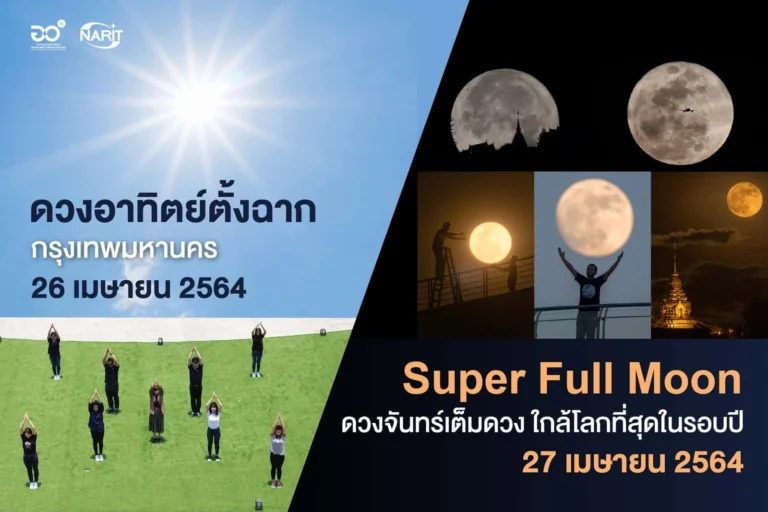สถาบันวิจัยดาราศาสตร์แห่งชาติ (องค์การมหาชน) กระทรวงการอุดมศึกษา วิทยาศาสตร์ วิจัยและนวัตกรรม ชวนติดตาม 2 ปรากฏการณ์ ส่งท้ายเดือนเมษายน 2564 “ดวงอาทิตย์ตั้งฉากกรุงเทพมหานคร” ชาวกรุงเตรียมไร้เงา วันจันทร์ที่ 26 เมษายน 2564 เวลาประมาณ 12:16 น. และ “ดวงจันทร์เต็มดวงใกล้โลกที่สุดในรอบปี” หรือ ซูเปอร์ฟูลมูน ในวันอังคารที่ 27 เมษายน 2564 เวลา 22:25 น.