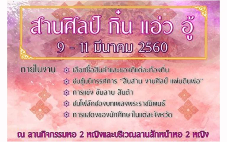 เชิญเที่ยวงาน สานศิลป์ กิ๋น แอ่ว อู้ ประจำปี 2559 วันที่ 9 – 11 มีนาคม 2560 นี้ ณ ลานสักหน้าหอ 2 หญิง มช. yawaredMarch 3, 2017