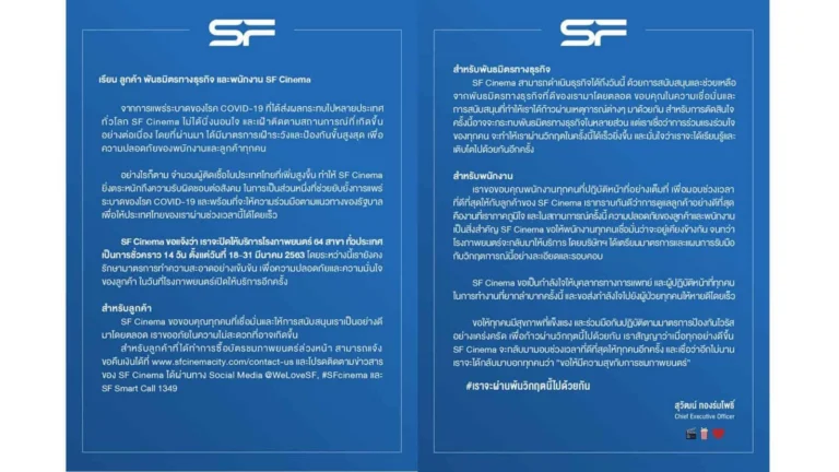 SF Cinema – โรงภาพยนตร์ เอส เอฟ แจ้งปิดให้บริการทุกสาขาทั่วประเทศ ชั่วคราว เป็นเวลา 14 วัน ตั้งแต่ 18-31 มีนาคม 2563 yawaredMarch 31, 2020