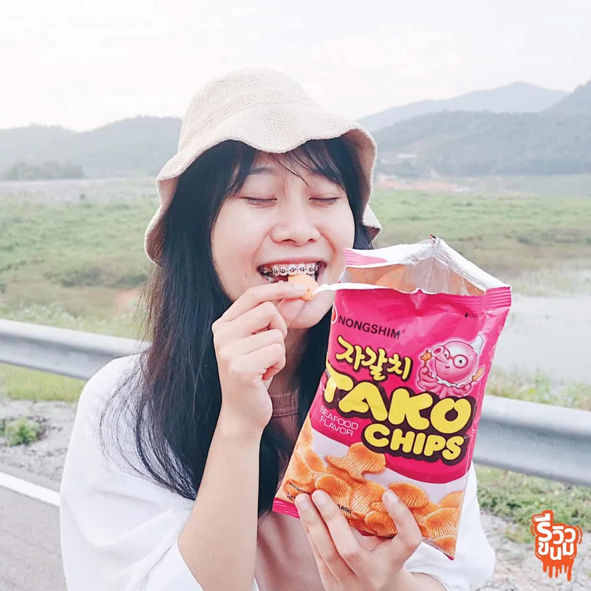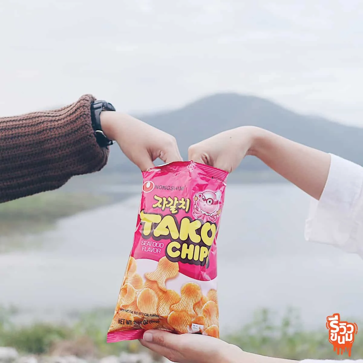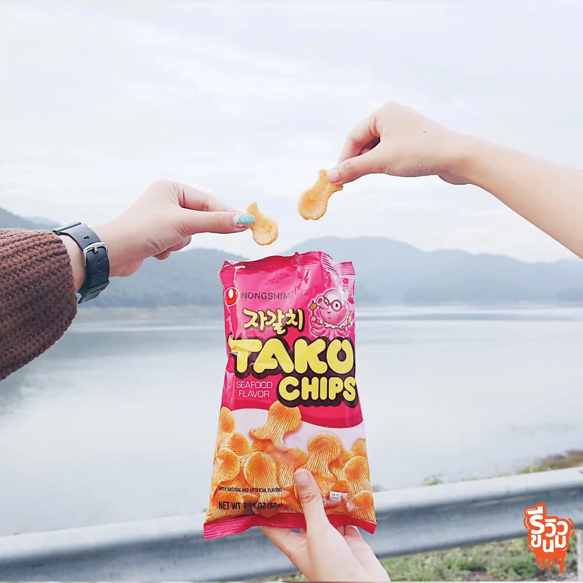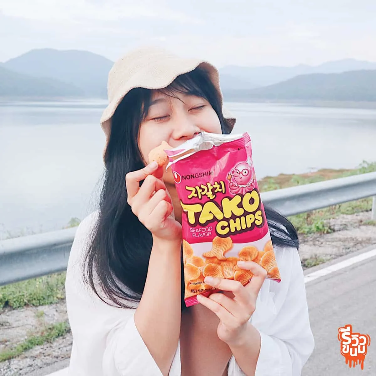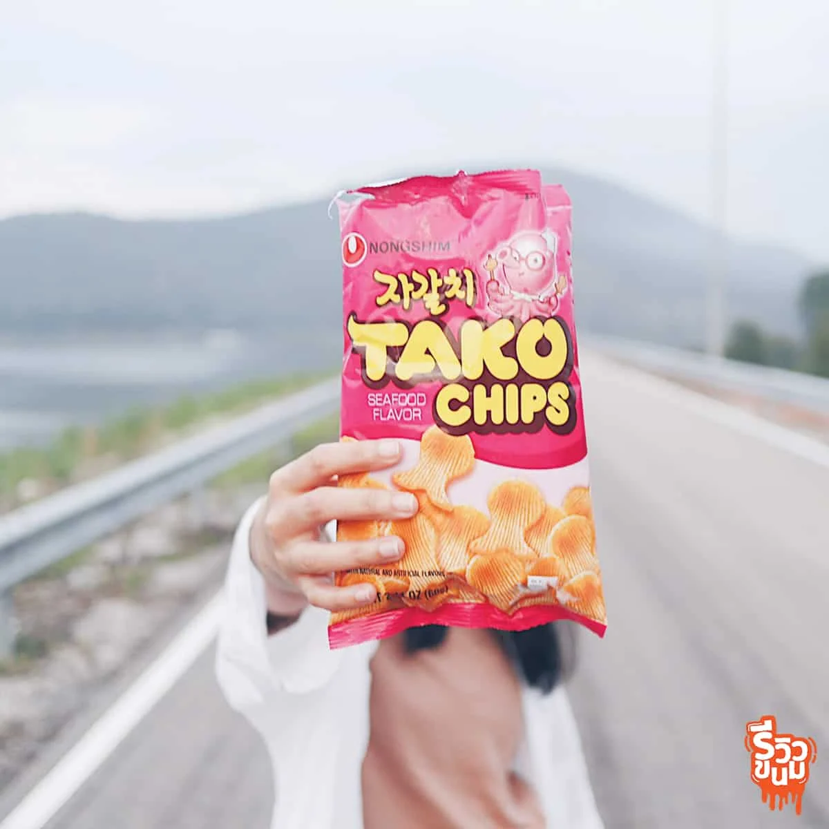 TAKO CHIPS เป็นขนมจากประเทศเกาหลี มีลักษณะเหมือนกับน้องปลาหมึก รูปร่างกลมน่ารัก แล้วก็ต้องบอกเลยว่ารสชาติก็ยังเหมือนกับปลาหมึกแอบมีรสเผ็ดนิดๆ เค็มหน่อยๆ หอม กรอบ อร่อย กระตุ้นความอยากอาหารได้เป็นอย่างดี