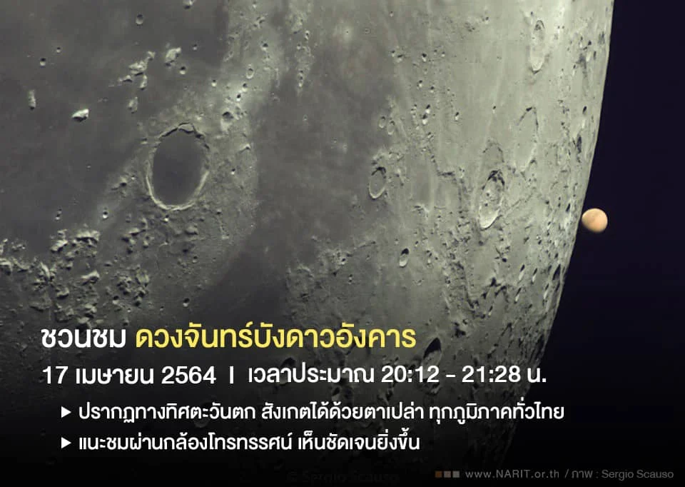 นายศุภฤกษ์ คฤหานนท์ หัวหน้างานบริการวิชาการและสื่อสารทางดาราศาสตร์ เปิดเผยว่า คืนวันที่ 17 เมษายน 2564 จะเกิดปรากฏการณ์ดวงจันทร์บังดาวอังคาร เริ่มสังเกตการณ์ได้ตั้งแต่ช่วงหัวค่ำทางทิศตะวันตก วัตถุทั้งสองอยู่เคียงกันสูงจากขอบฟ้าประมาณ 33 องศา จากนั้นดาวอังคารจะเริ่มสัมผัสขอบดวงจันทร์ในเวลาประมาณ 20:12 น. จะสังเกตเห็นดาวอังคารค่อย ๆ ลับหายไปด้านหลังของดวงจันทร์ และโผล่พ้นออกมาทั้งดวงอีกครั้งในเวลาประมาณ 21:28 น. อยู่สูงจากขอบฟ้าทิศตะวันตกประมาณ 17 องศา (ข้อมูลดังกล่าวคำนวณจากพื้นที่กรุงเทพมหานคร หากสังเกตการณ์ในพื้นที่อื่น ช่วงเวลาของการบังอาจจะเริ่มและสิ้นสุดไม่พร้อมกัน)