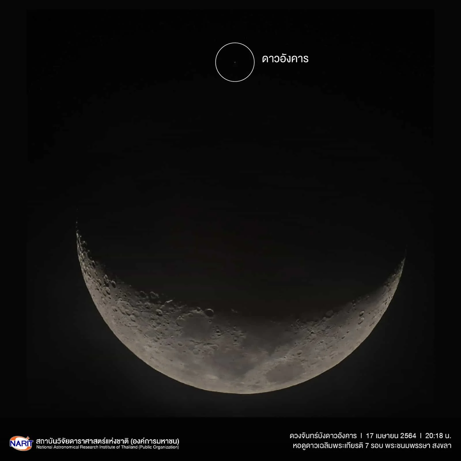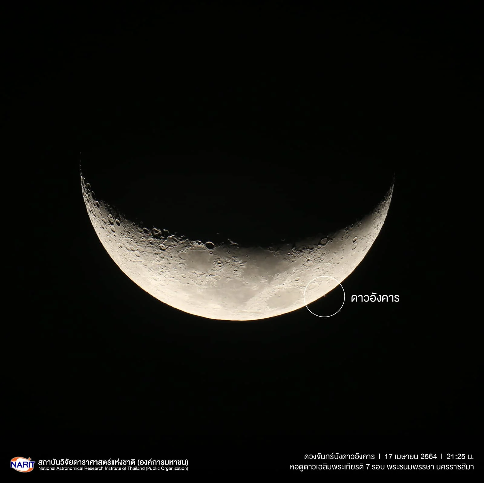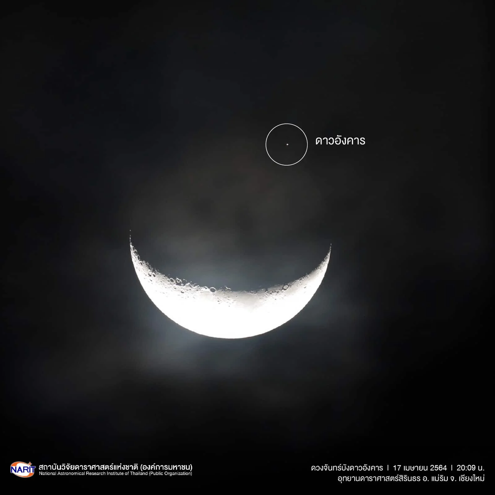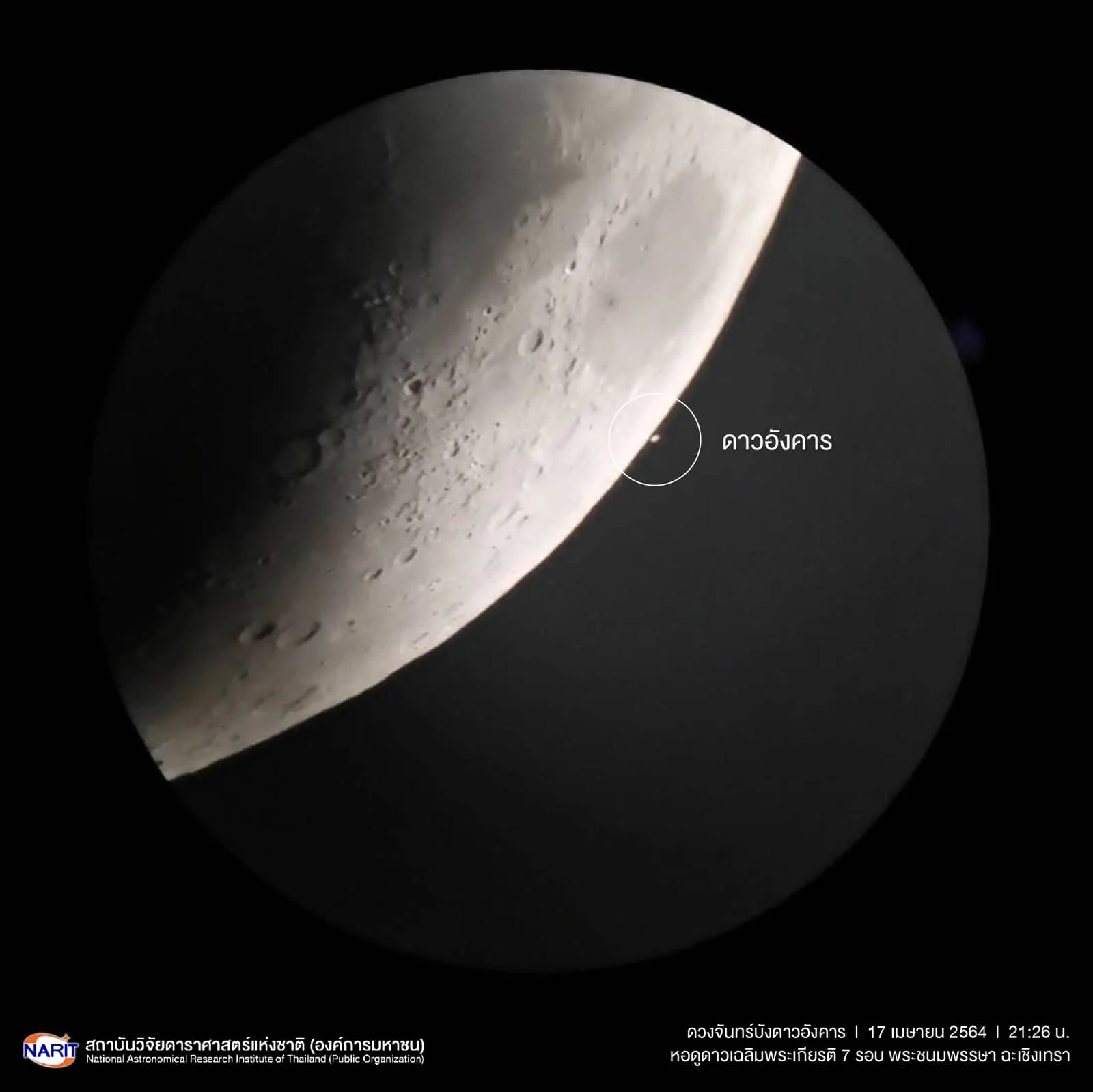 สถาบันวิจัยดาราศาสตร์แห่งชาติ (องค์การมหาชน) (สดร.) กระทรวงการอุดมศึกษา วิทยาศาสตร์ วิจัยและนวัตกรรม เผยภาพ “ดวงจันทร์บังดาวอังคาร” คืน 17 เมษายน 2564 ก่อนดาวอังคารแตะขอบดวงจันทร์ เวลา 20:09 น. บันทึกภาพ ณ อุทยานดาราศาสตร์สิรินธร อ.แม่ริม จ.เชียงใหม่ และขณะดาวอังคารโผล่พ้นออกจากดวงจันทร์ เวลา 21:26 น. บันทึกภาพ ณ หอดูดาวเฉลิมพระเกียรติ 7 รอบ พระชนมพรรษา ฉะเชิงเทรา