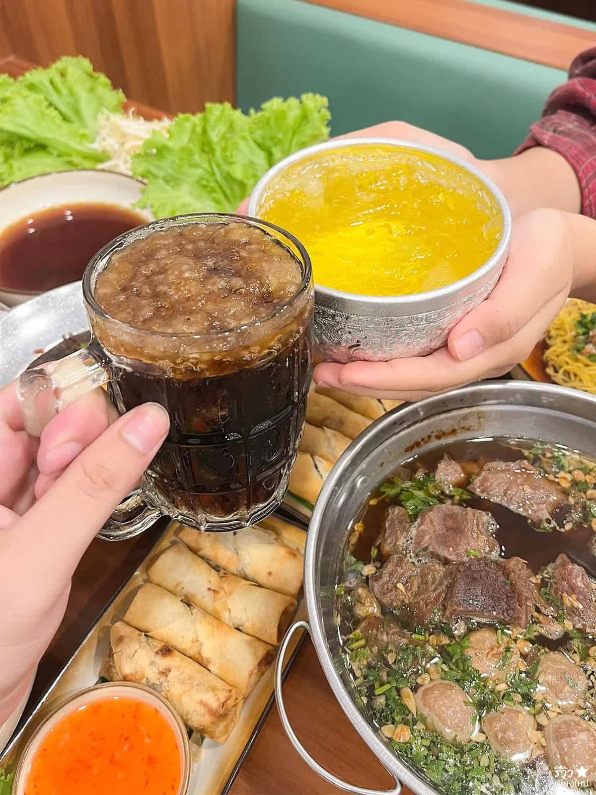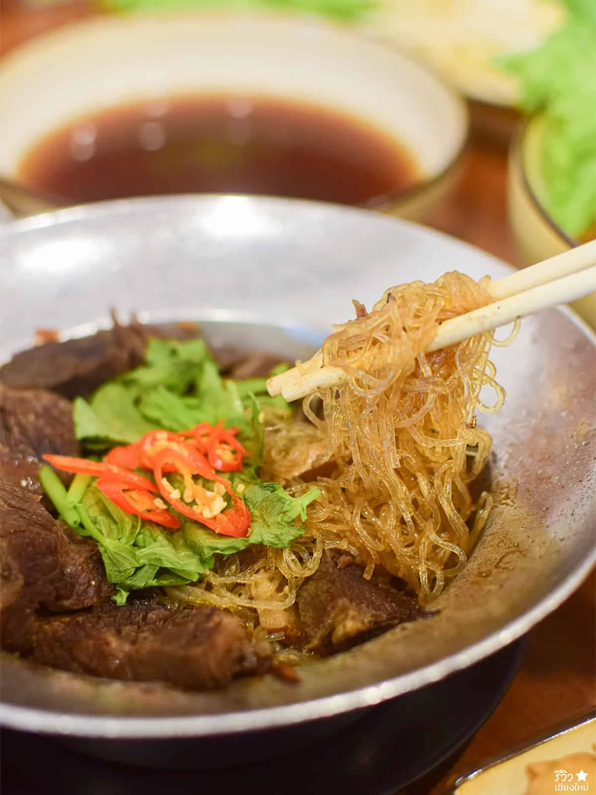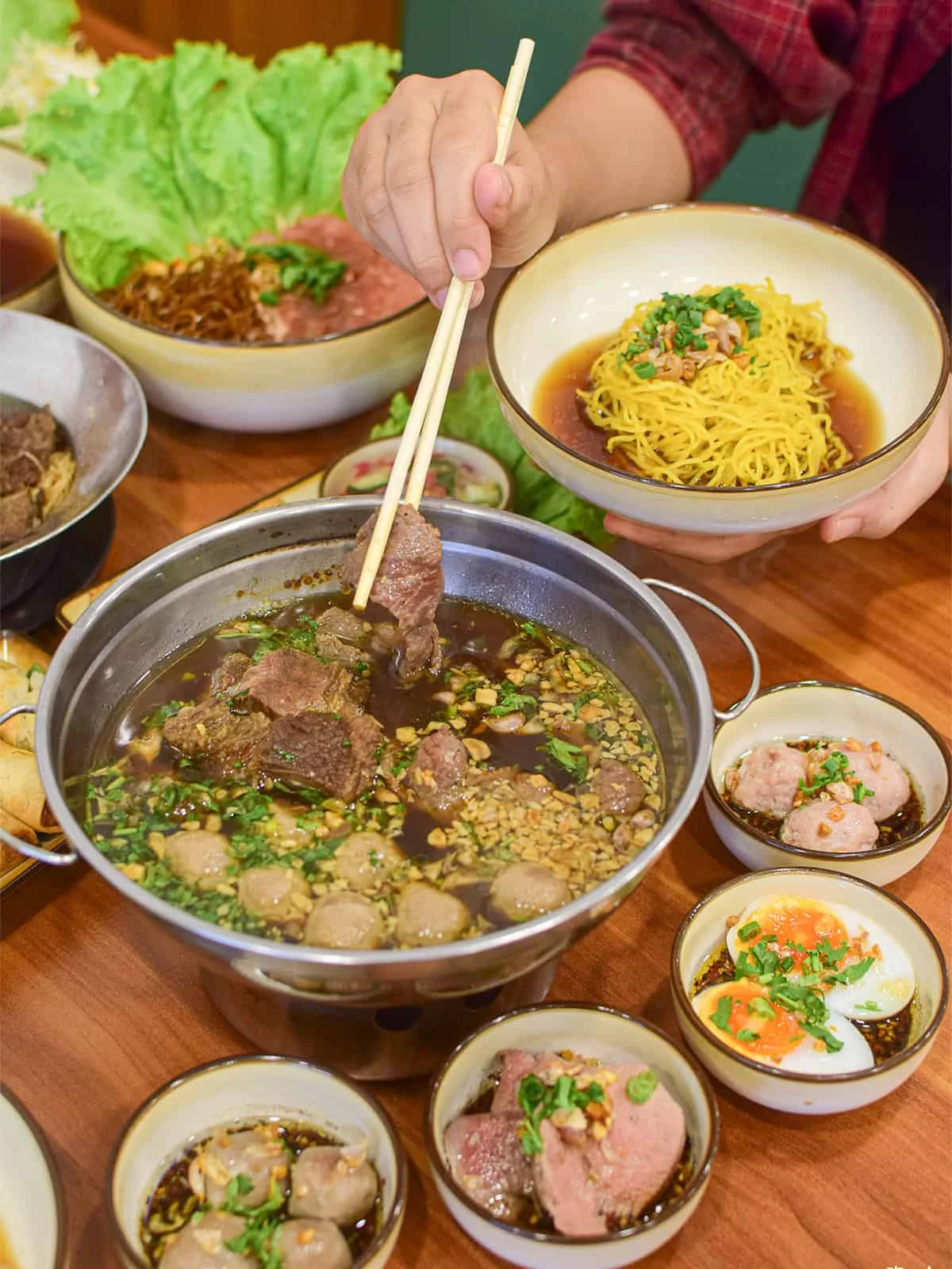 เมนูที่นี่ก็มีหลากหลาย ทั้งเมนูก๋วยเตี๋ยวที่เราสามารถเลือกเนื้อในส่วนที่ชอบได้เลย เช่น ข้าวหน้าเนื้อพะโล้ เนื้ออบวุ้นเส้น ลวกจิ้มต่างๆ หรือเมนูทานเล่น ปอเปี๊ยะเนื้อชีส ปอเปี๊ยะวุ้นเส้น และ น้ำอัดลมวุ้น น้ำสมุนไพร ที่ปัจจุบันเริ่มหาทานยากแล้วแต่ที่ร้านนี้มี!! เมนูเด็ดที่ไม่ควรพลาดเลยก็คือ ชุดเซตหม้อไฟ ที่รับประกันความฟินจากเครื่องเคียงที่ร้านให้มาแบบจัดเต็ม ฟินๆ กับเนื้อที่ละลายในปากและน้ำซุปที่แทบไม่ต้องแตะเครื่องปรุง เพราะซุปเขารสชาติดีเข้มข้นสุดๆ