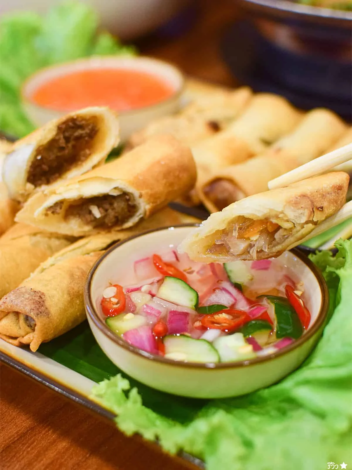 ปอเปี๊ยะที่นี่ไส้แน่น จะมีไส้ เนื้อชีส และวุ้นเส้น อย่างเนื้อชีสก็คือให้ความรู้สึก นุ่ม หอม อยู่ในปาก วุ้นเส้นที่ห่อมาพร้อมกับผักต่างๆ จิ้มกับน้ำจิ้มตัดกันอย่างลงตัว กรอบมากๆ