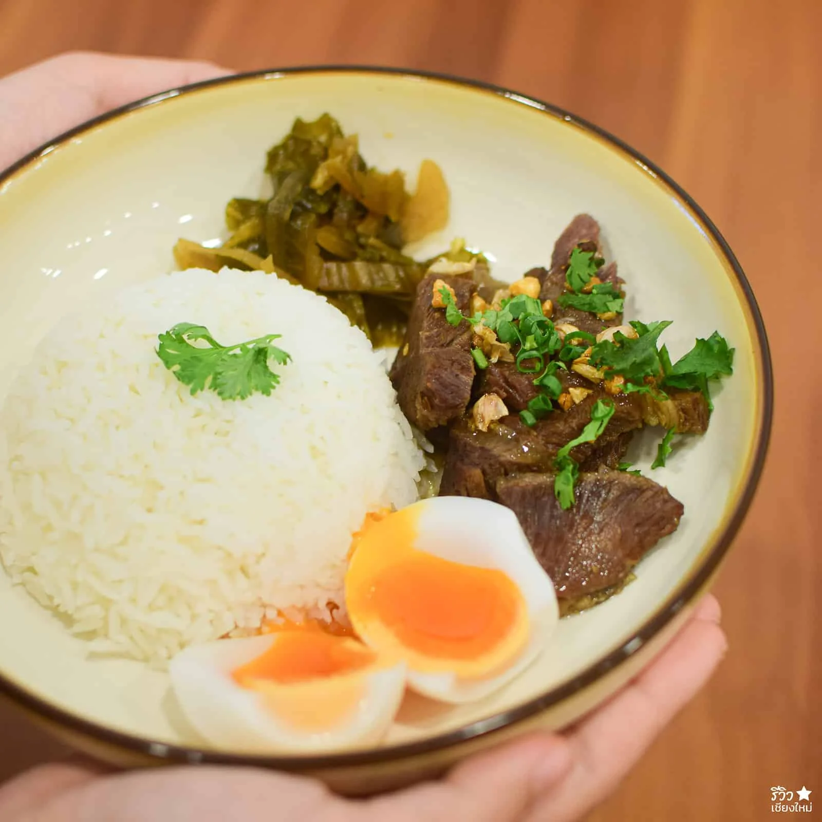 ข้าวหน้าเนื้อ เนื้อตุ๋นชิ้นใหญ่นุ่มๆ มาพร้อมกับไข่ลวกยางมะตูม และผักกาดดอง ทานตอนร้อนๆ ก็คือเข้ากันมาก เนื้อนุ่มแทบจะไม่ต้องเคี้ยวเลย