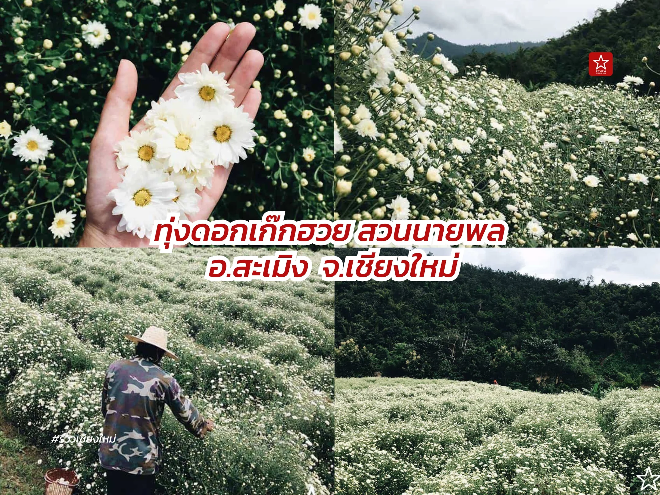 ไร่เก๊กฮวยนายพล ที่กำลังเบ่งบานสีขาวสะพรั่ง ที่ บ้านอมลอง อำเภอสะเมิง และที่สำคัญบานเพียงแค่ปีละครั้งเท่านั้นค่ะ เพราะฉะนั้นพลาดไม่ได้เลย ทุ่งเก๊กฮวยสวยๆ ไร่เก๊กฮวยนายพล แห่งนี้ ตั้งอยู่ บ้านอมลอง อำเภอสะเมิง จังหวัดเชียงใหม่ ค่ะ ที่นี่จะมีการปลูกดอกเก๊กฮวยไล่ลงมาตามแนวทิวเขาสวยงาม แน่นอนว่า ดอกเก๊กฮวยที่บานอยู่เบื้องล่างตัดกับท้องฟ้า สวยอลังการสุดๆ งานนี้มาเที่ยวถ่ายรูปบอกเลยว่าได้รูปสวยมากๆ