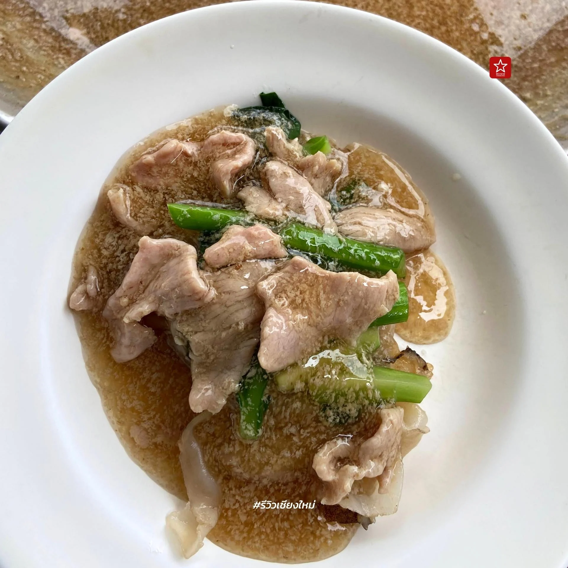 เมนูที่ใครมาก็ต้องสั่งคือ เล็กเนื้อน้ำใส สำหรับคนที่ไม่กินเนื้อเขาก็มีราดหน้าหมูจำหน่ายด้วยเช่นกัน