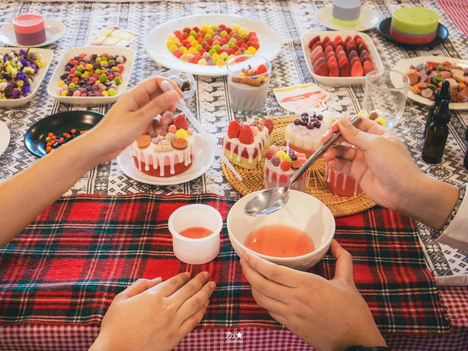 บรรยากาศระหว่างทำเค้กจ้าว ซึ่งที่ร้านจะมีรูปแบบหน้าเค้กให้เราเลือกตกแต่งเยอะมาก หรือใครอยากแต่งหน้าเค้กตามรูปแบบของตัวเองก็ได้เน้อ ลงมือจริงๆ ไม่ได้ยากอย่างที่คิดเลย ผู้ชายยังทำได้น้าาาา