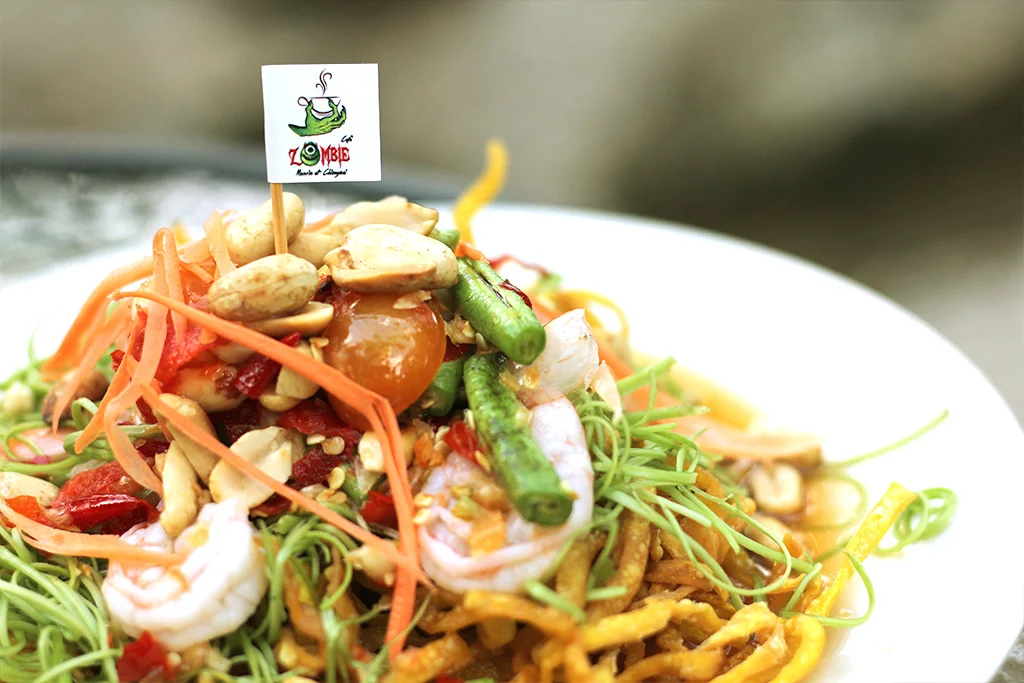 ถ้ามากับกลุ่มเพื่อนๆแนะนำเลยกับเมนู ยำซอมบี้ สีสันสวยงามน่ากิน ที่เหนือกว่าเมนูยำทั่วๆไปด้วยการใส่ บะหมี่กรอบๆ กับ ผักบุ้งฉีกเป็นเส้นบางๆ กุ้งลวกสดๆ คลุกเคล้าแบบเข้าถึงกับน้ำยำรสแซ่บ กินแกล้มกับผักสดๆ รสชาติเปรี้ยวเผ็ดแซ่บกับความกรอบของหมี่กรอบ เจ๋งขอบอกว่าเข้ากันได้ดีมากๆ